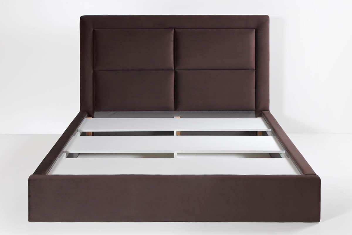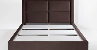 Высокое изголовье кровати выполнено в технике «каретная стяжка». Благодаря высокой посадке матраса, вставать с кровати будет очень удобно и легко.