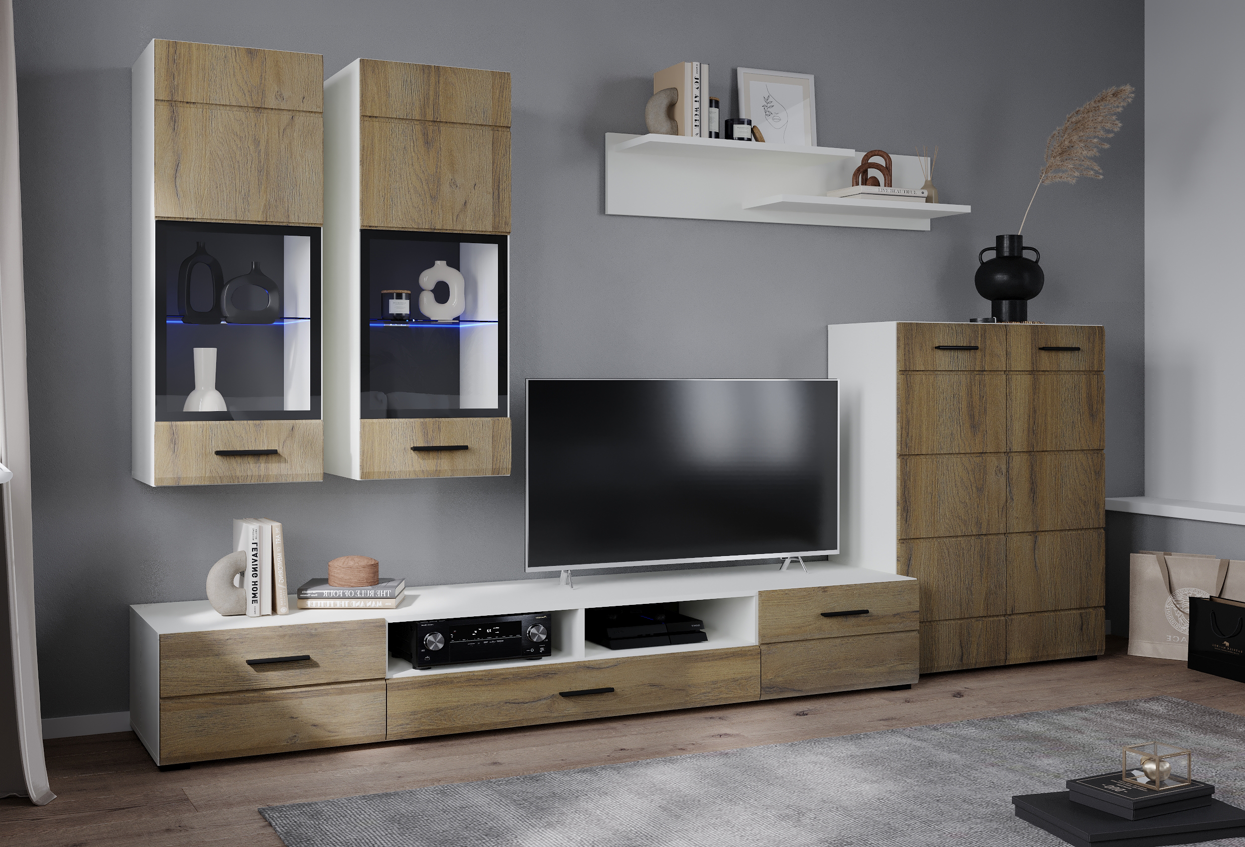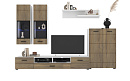 В комплект входят 5 модулей: тумба ТВ, напольный шкаф, полка, 2 навесных шкафа со стеклом (укомплектованы подсветкой).