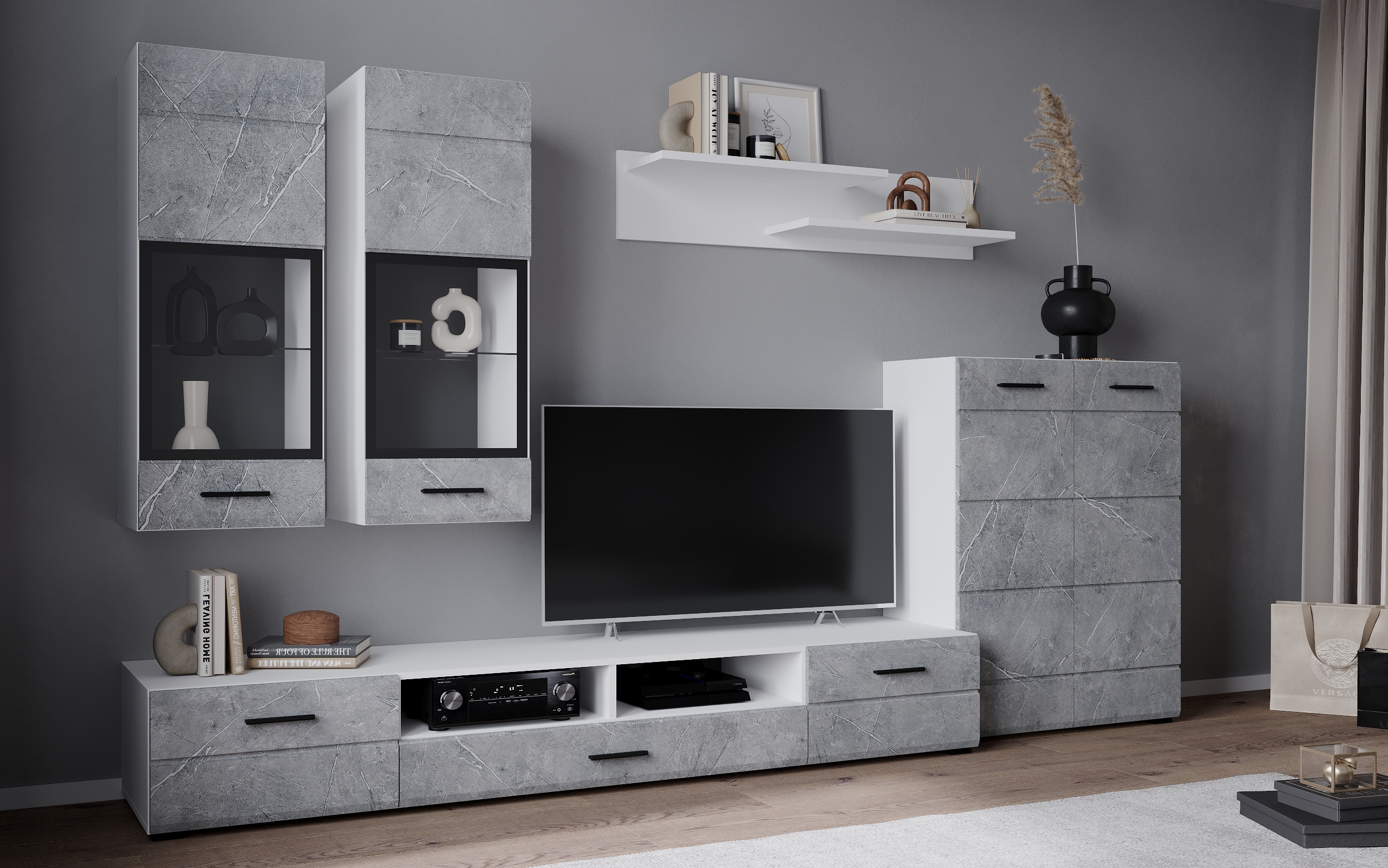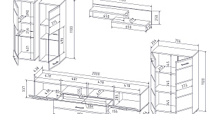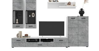 В комплект входят 5 модулей: тумба ТВ, напольный шкаф, полка, 2 навесных шкафа со стеклом.