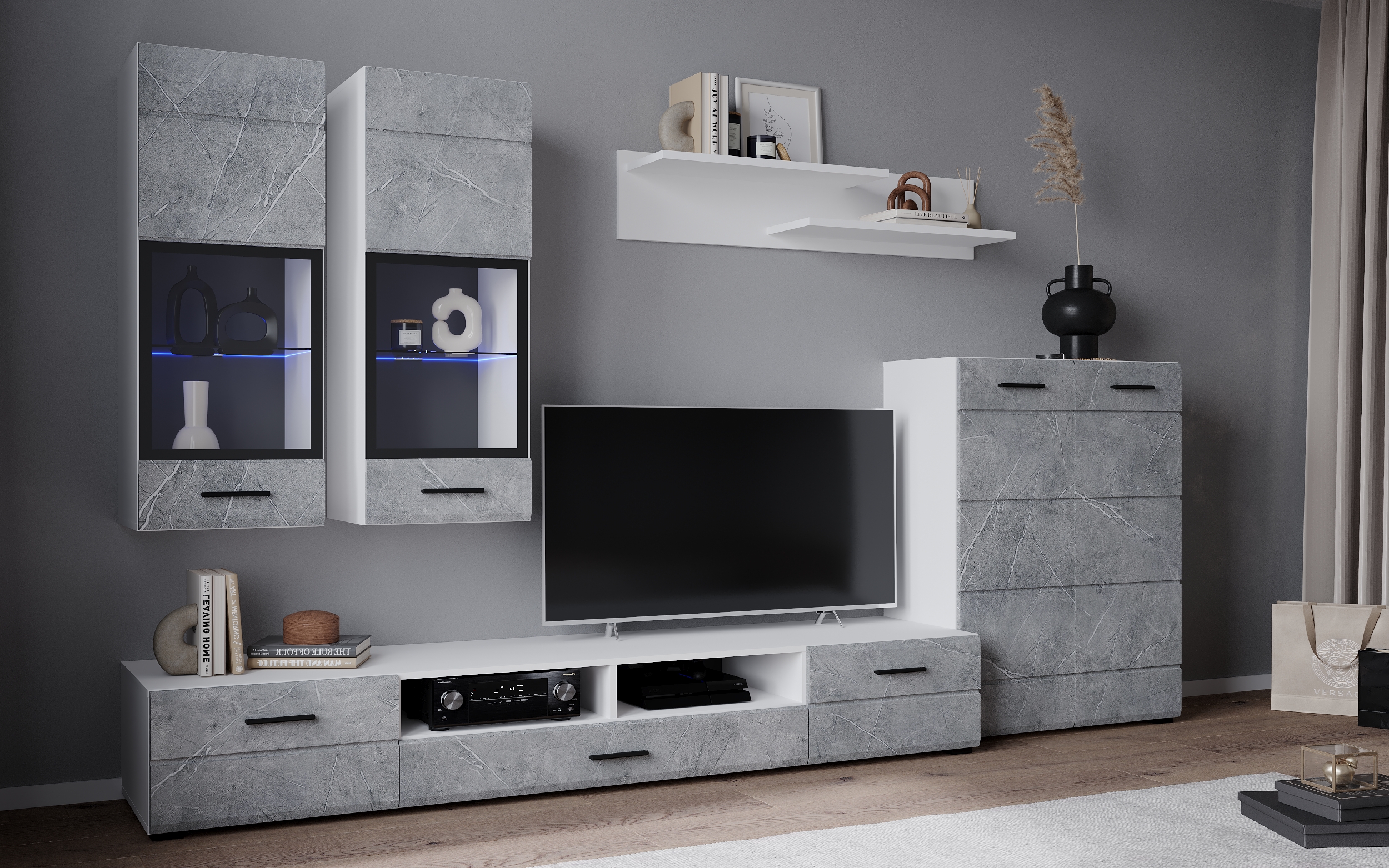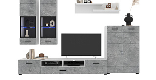 В комплект входят 5 модулей: тумба ТВ, напольный шкаф, полка, 2 навесных шкафа со стеклом (укомплектованы подсветкой).