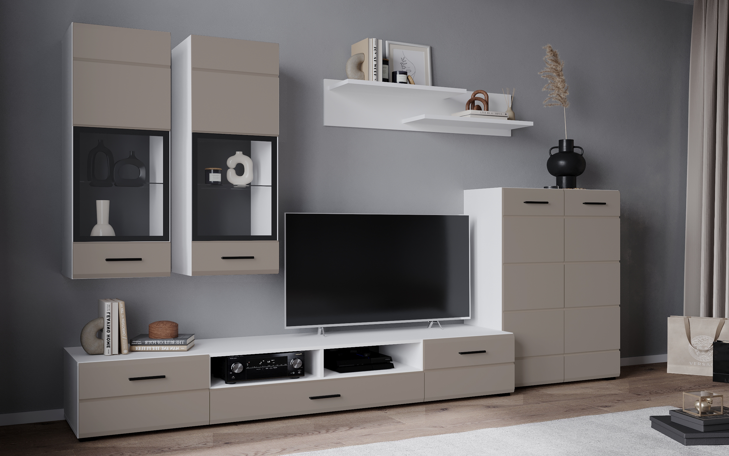 В комплект входят 5 модулей: тумба ТВ, напольный шкаф, полка, 2 навесных шкафа со стеклом.