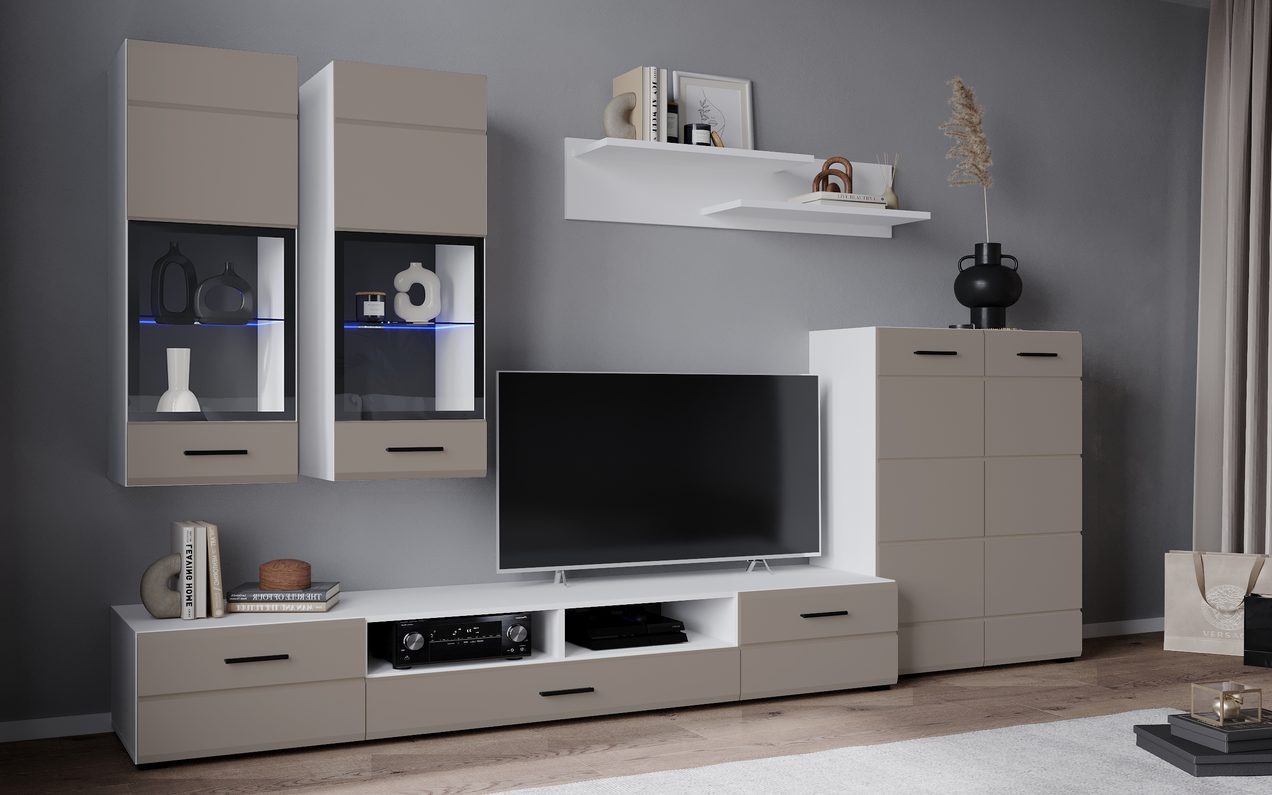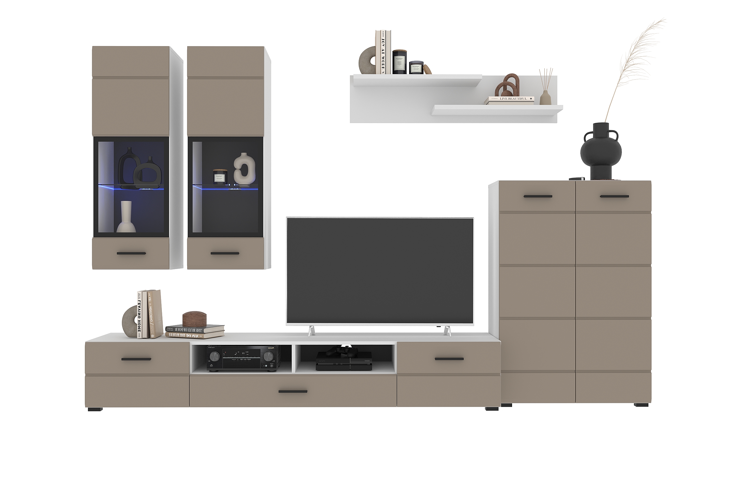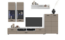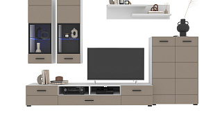 В комплект входят 5 модулей: тумба ТВ, напольный шкаф, полка, 2 навесных шкафа со стеклом (укомплектованы подсветкой)