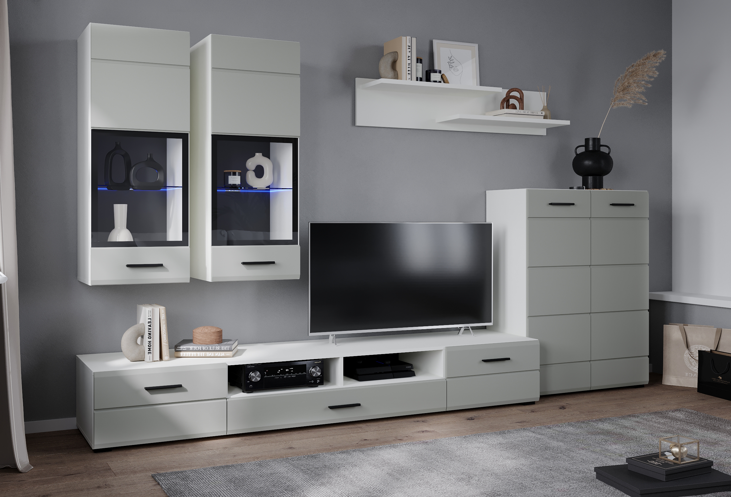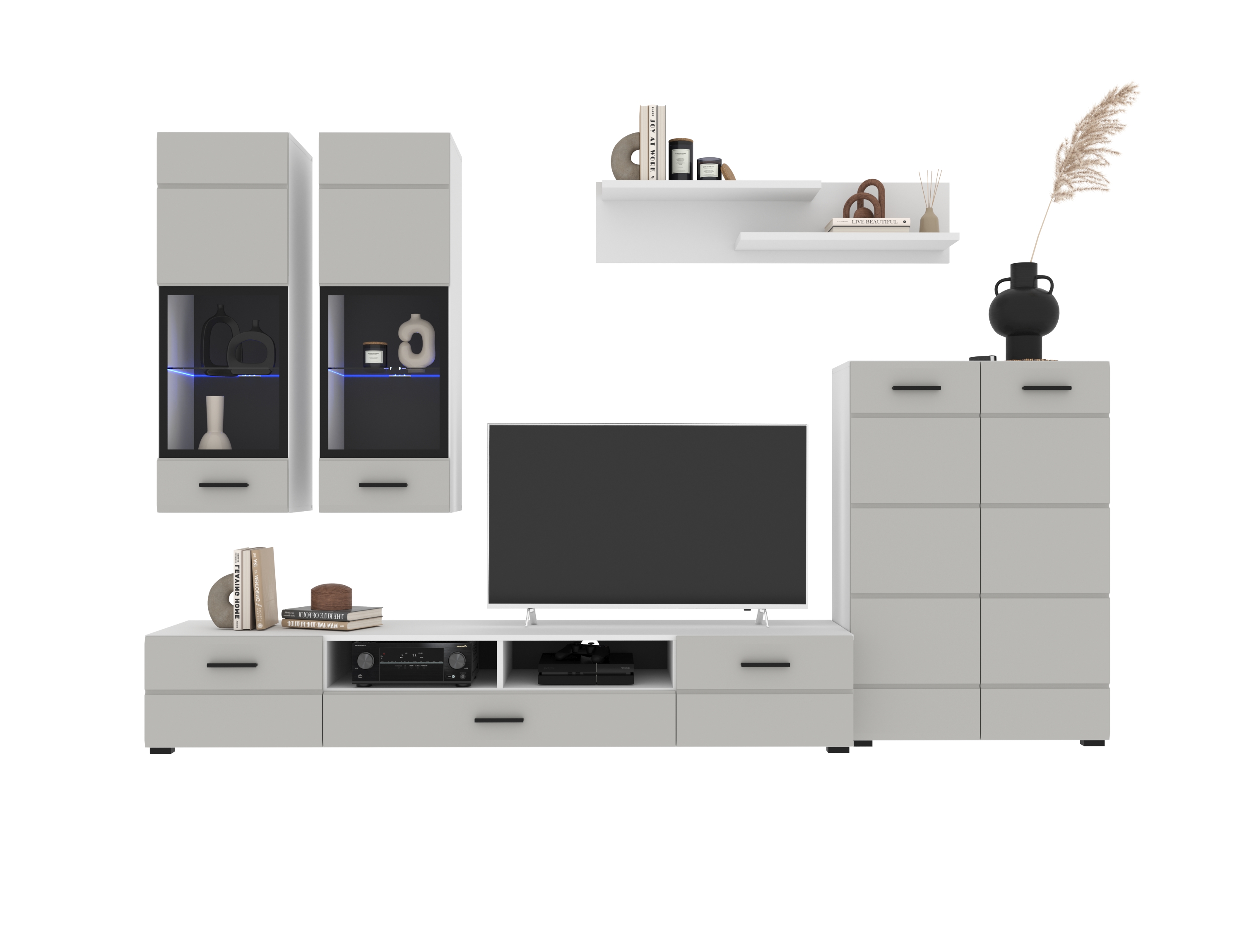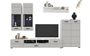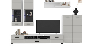 В комплект входят 5 модулей: тумба ТВ, напольный шкаф, полка, 2 навесных шкафа со стеклом (укомплектованы подсветкой).