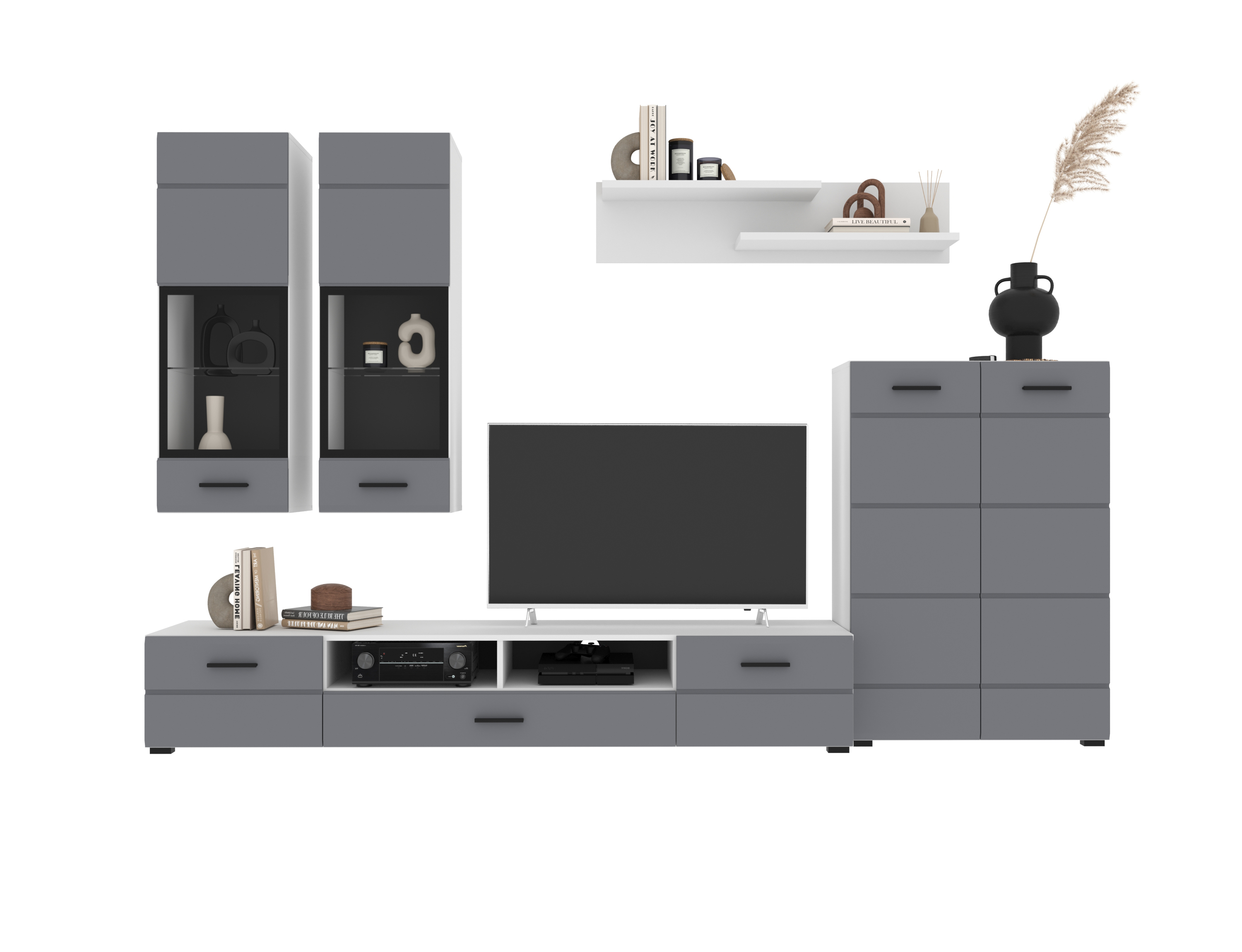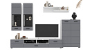 В комплект входят 5 модулей: тумба ТВ, напольный шкаф, полка, 2 навесных шкафа со стеклом.