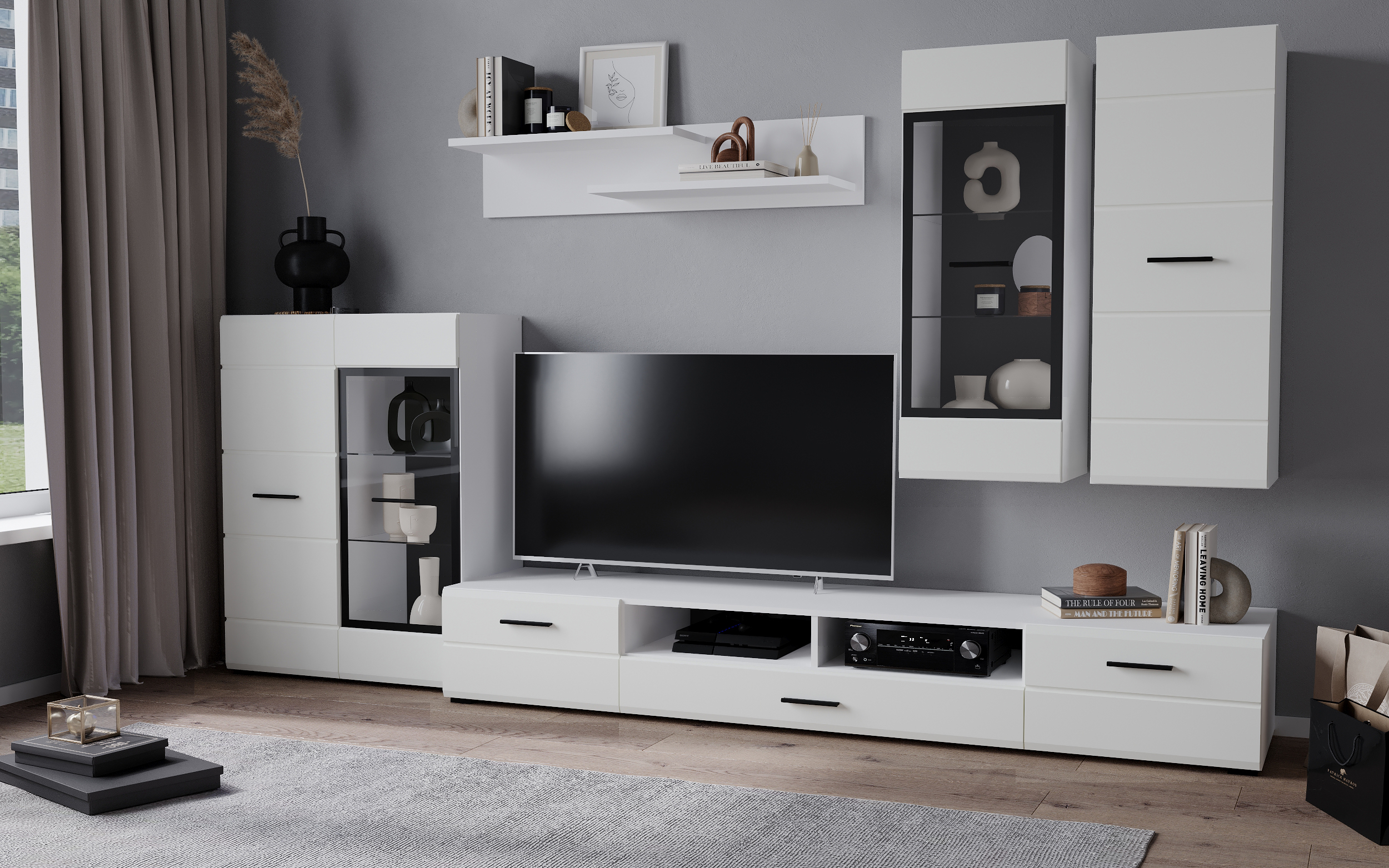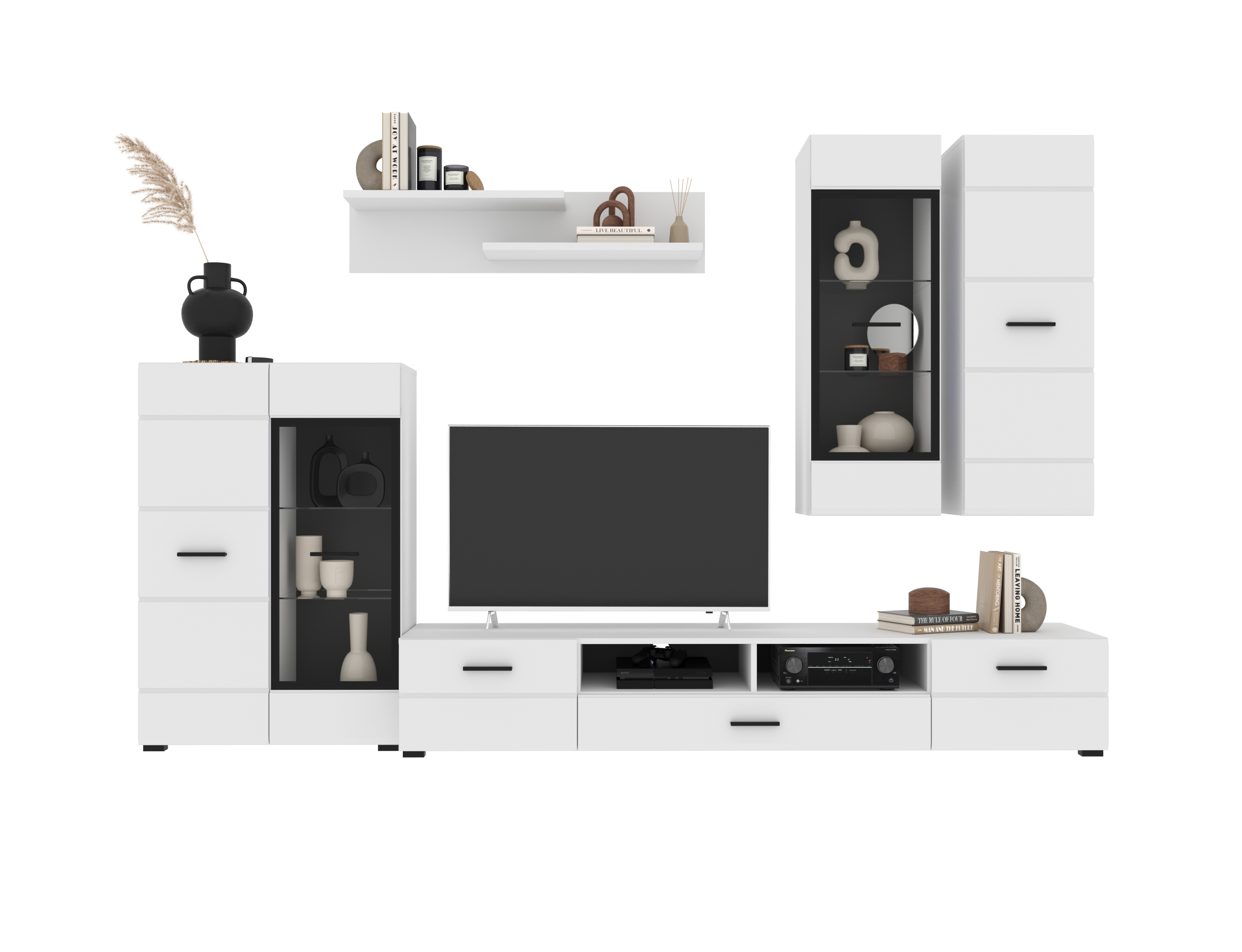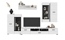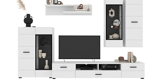 В комплект входят 5 модулей: тумба ТВ, напольный шкаф комбинированный со стеклом, полка, навесной шкаф со стеклом, навесной шкаф.