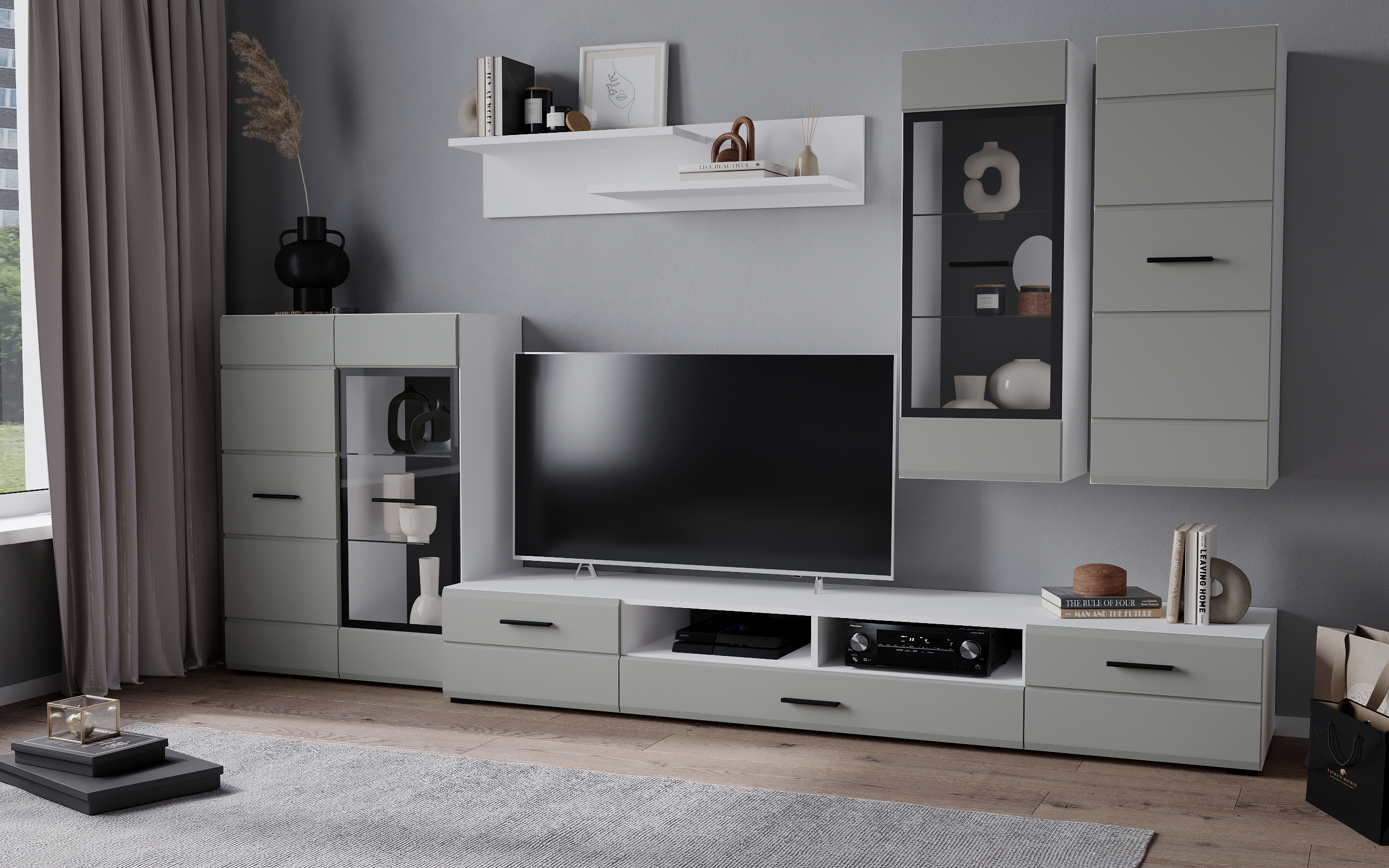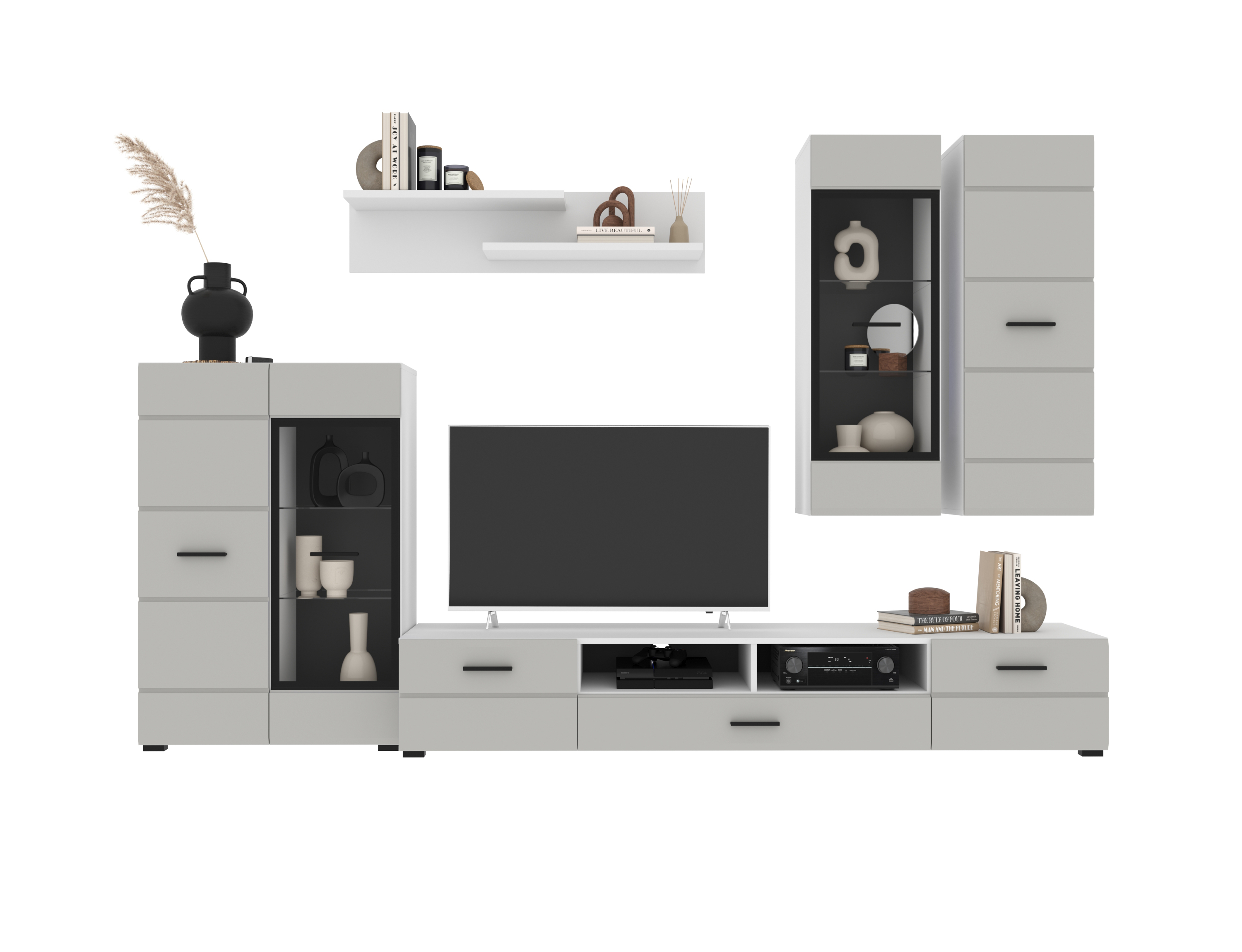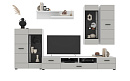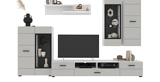 В комплект входят 5 модулей: тумба ТВ, напольный шкаф комбинированный со стеклом, полка, навесной шкаф со стеклом, навесной шкаф.