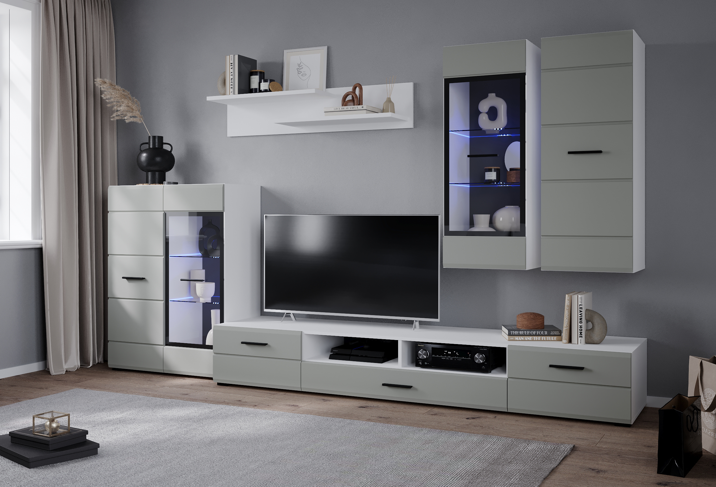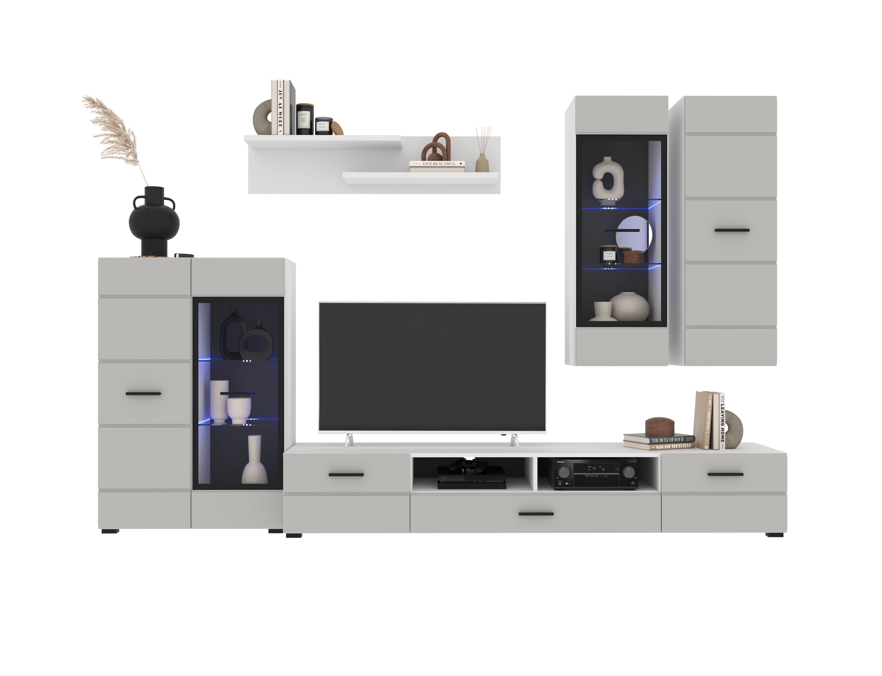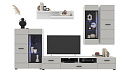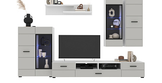В комплект входят 5 модулей: тумба ТВ, напольный шкаф комбинированный со стеклом (укомплектован подсветкой) , полка, навесной шкаф со стеклом (укомплектован подсветкой), навесной шкаф.