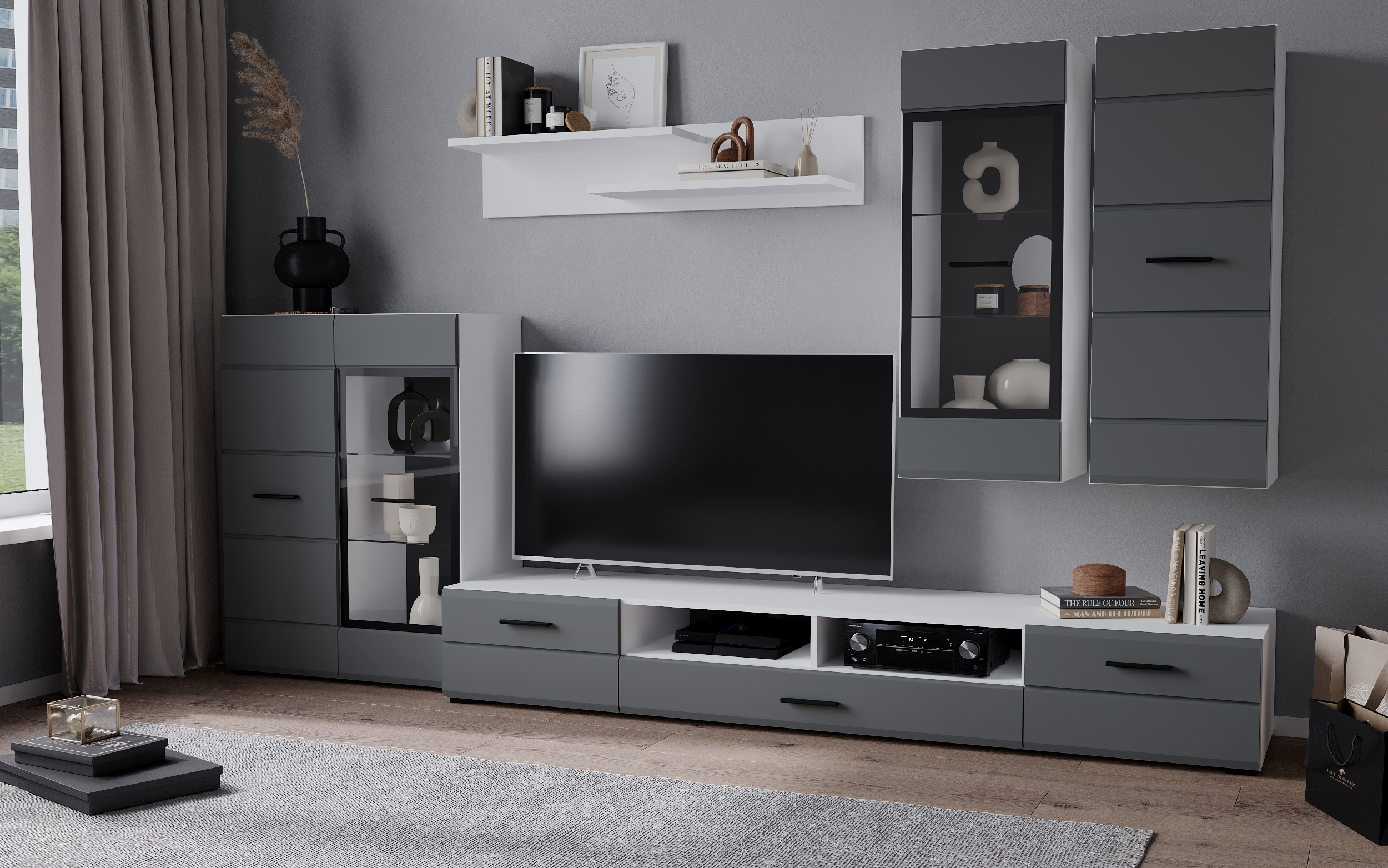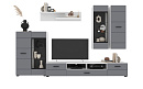 В комплект входят 5 модулей: тумба ТВ, напольный шкаф комбинированный со стеклом, полка, навесной шкаф со стеклом, навесной шкаф.
