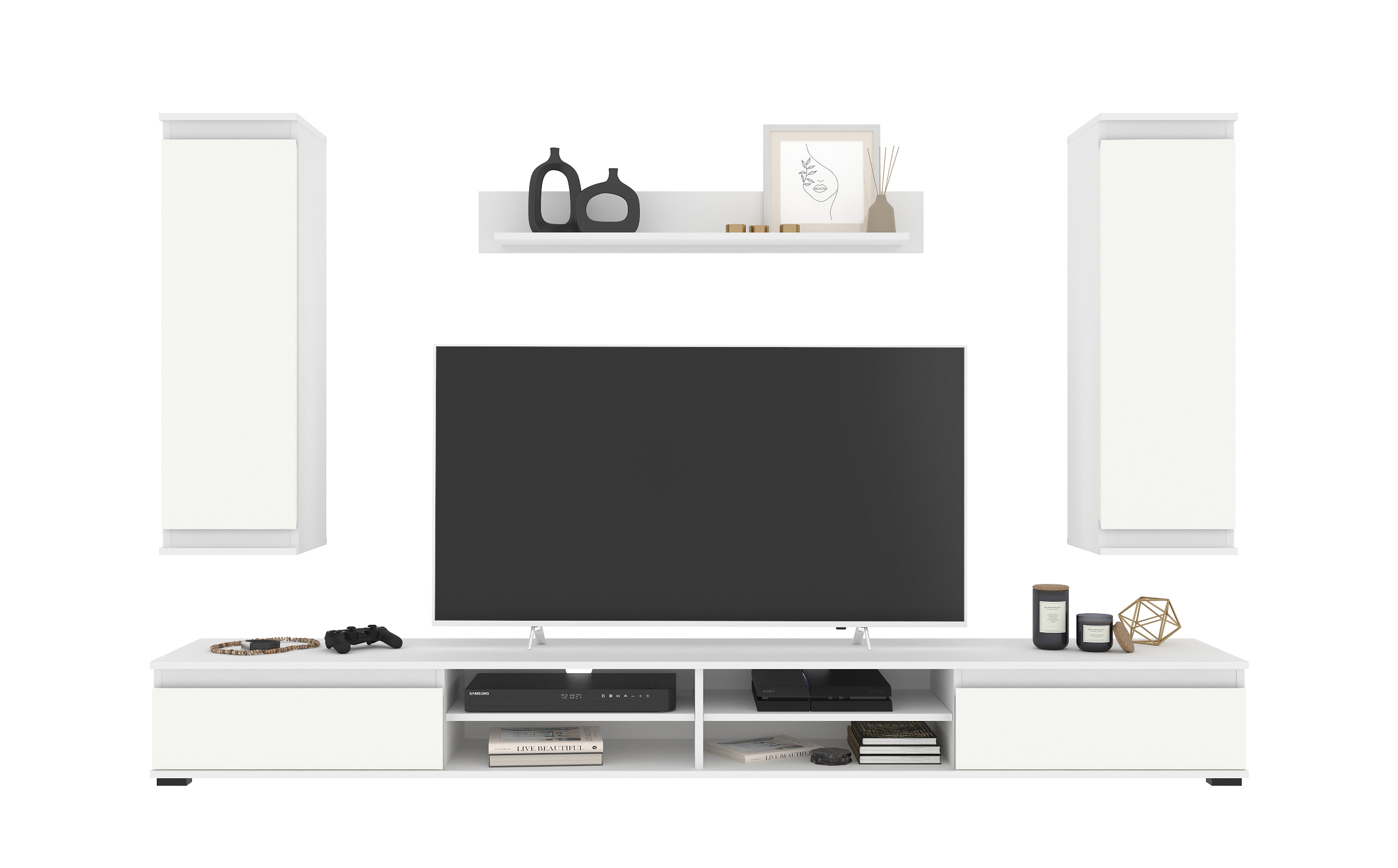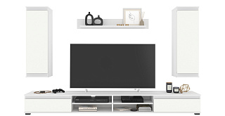 В набор входит 4 модуля: тумба ТВ, полка, 2 навесных шкафа.