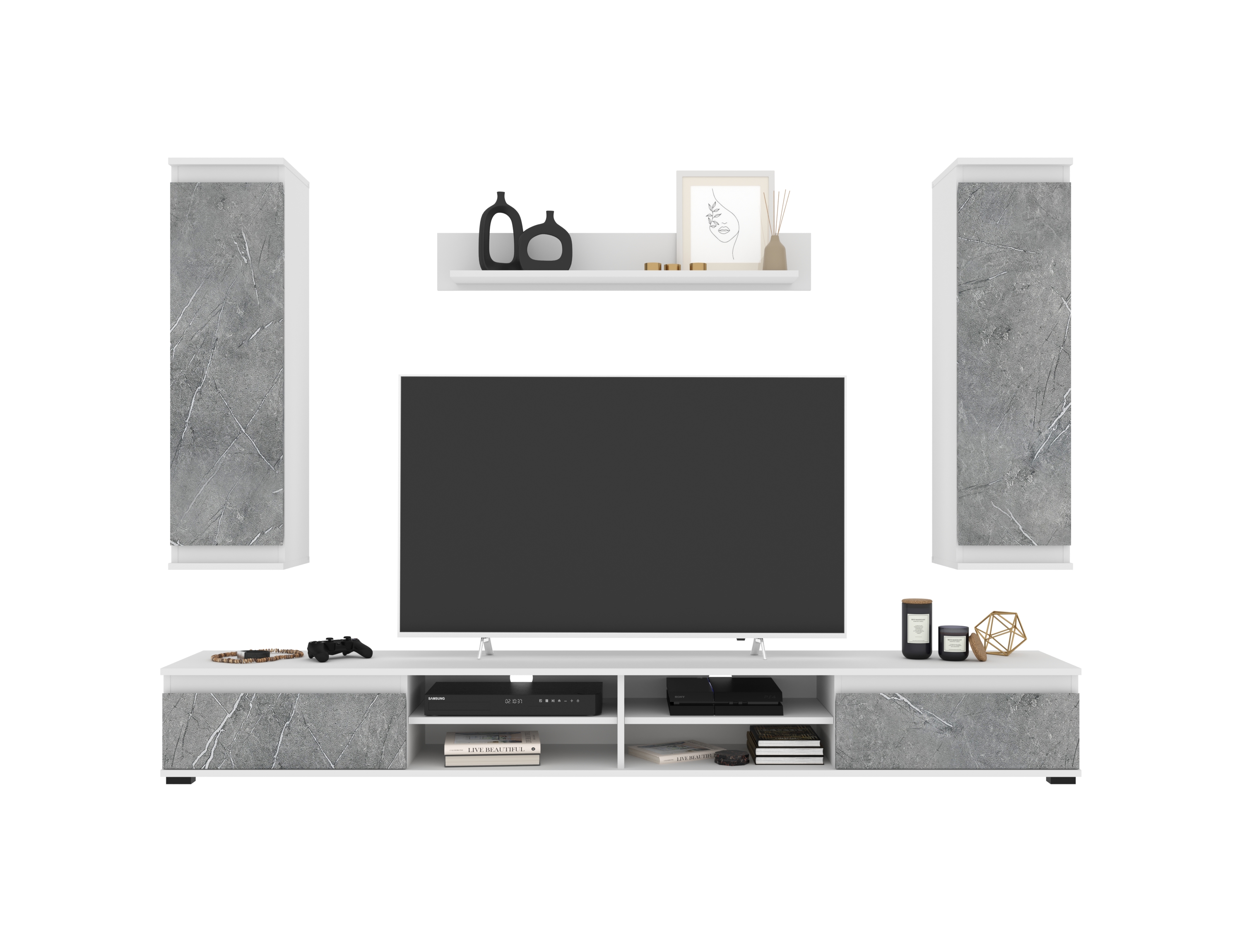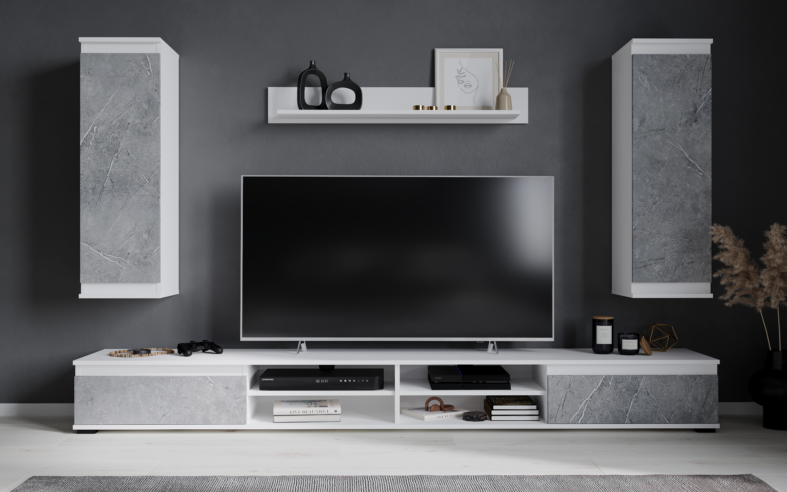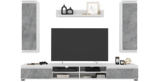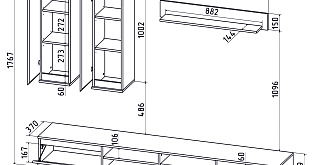 В набор входит 4 модуля: тумба ТВ, полка, 2 навесных шкафа.