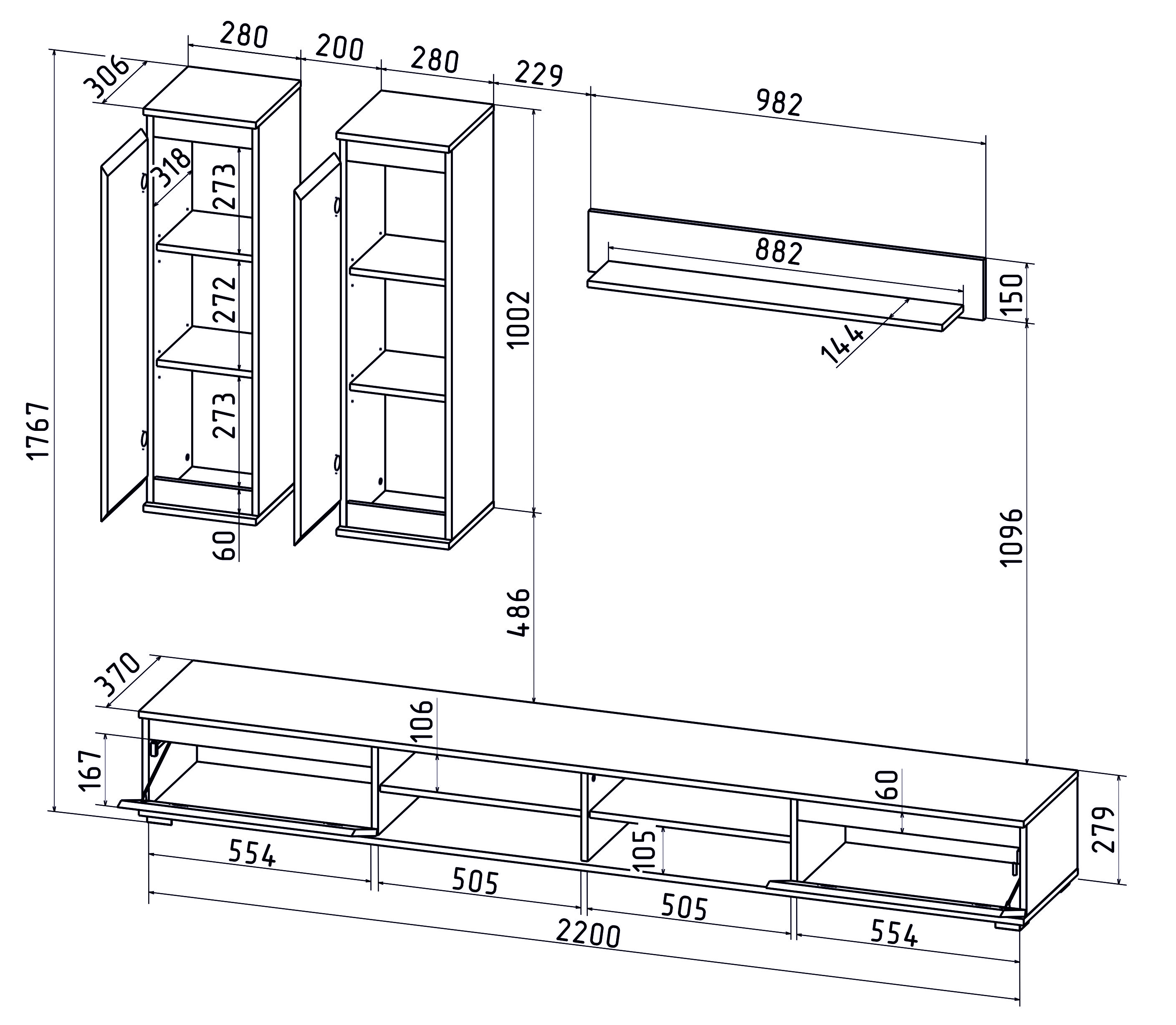 -Тумба ТВ: состоит из четырех открытых отделений и двух за двумя откидными дверьми. Вертикальные опорные стенки корпуса соединены горизонтальными крышками. Тумба устанавливается на пластиковые ножки (не регулируются) Шир./выс./гл. - 220/29/37 см, две откидные двери (используется барный проводник), четыре ниши;