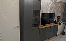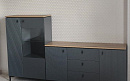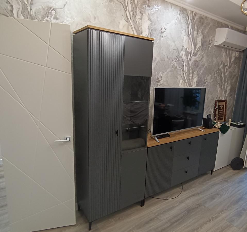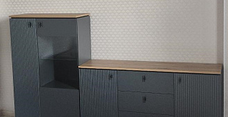Темные гладкие и рифленые фасады, стильные высокие ножки, черные матовые ручки, акцентная столешница - отличительные особенности набора.