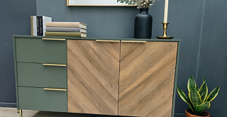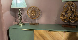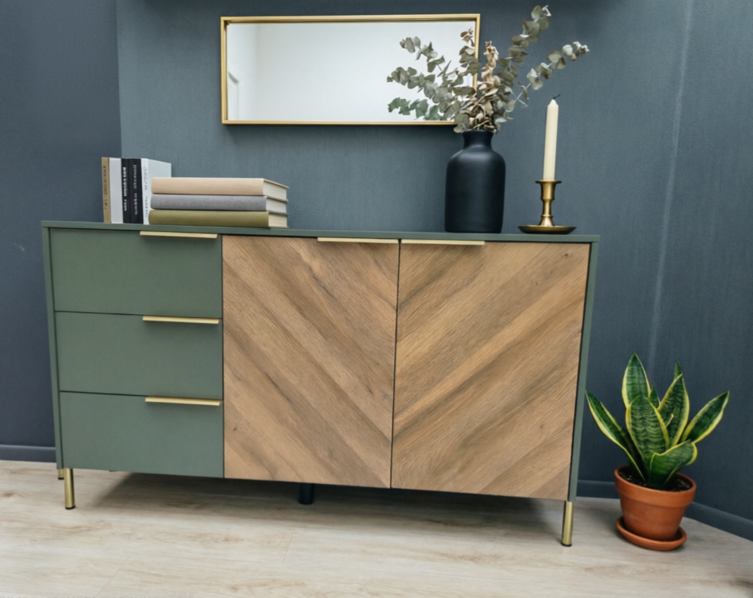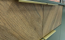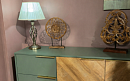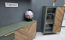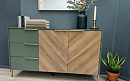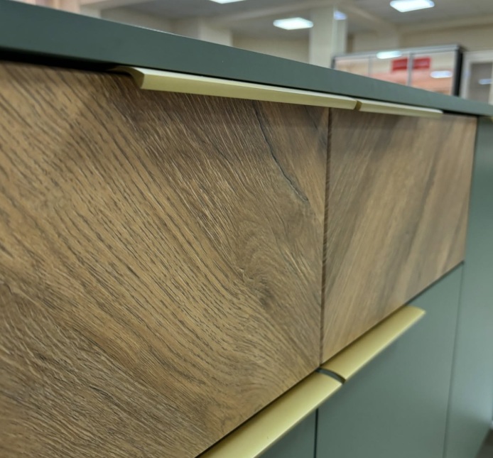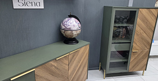 Изящное сочетание цветов натурального дерева и мягкого приглушенного зеленого колера сделают интерьер вашей гостиной индивидуальным и стильным. Легкость и современность коллекции придают металлические тонкие ручки и ножки в золотом цвете, невесомая LED-подсветка.