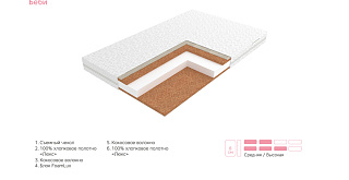 Натуральный гипоаллергенный материал. Благодаря пропитке из натурального латекса, волокна прочно скреплены в цельную плиту. Кокосовое волокно придает матрасу жёсткость и обладает бактерицидными свойствами. Производство – Enkev, Польша. |