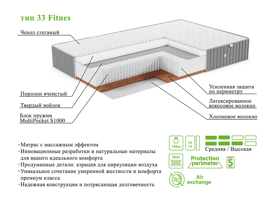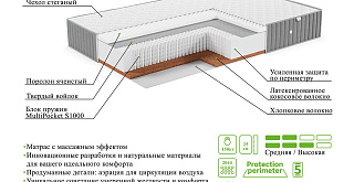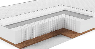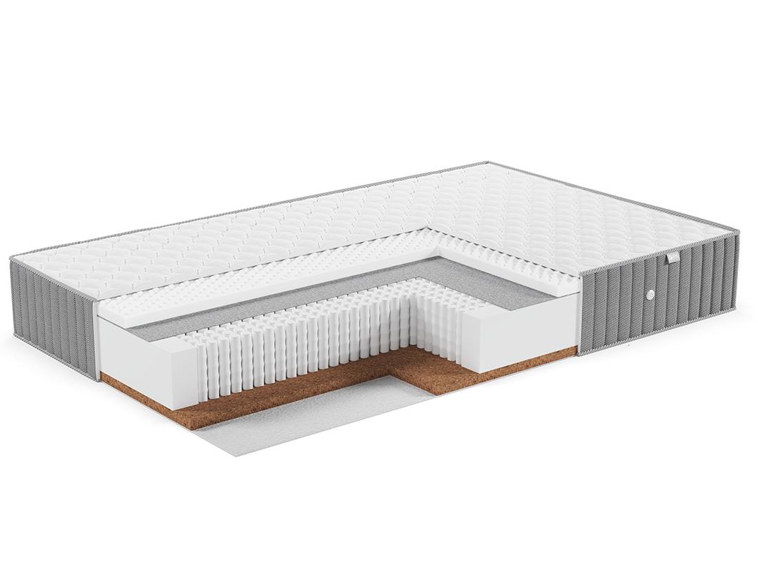 | Материал | Блок независимых пружин, Хлопковое полотно, Латексированная кокосовая плита, Усиление по периметру матраса |