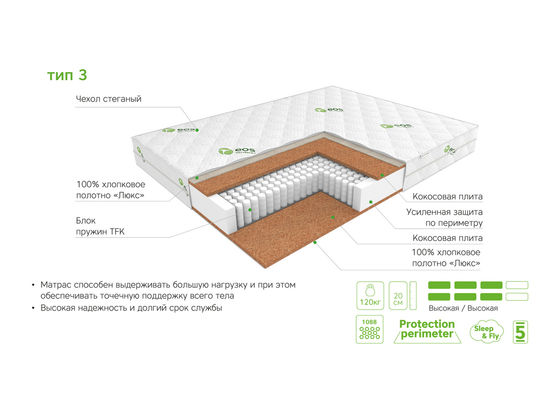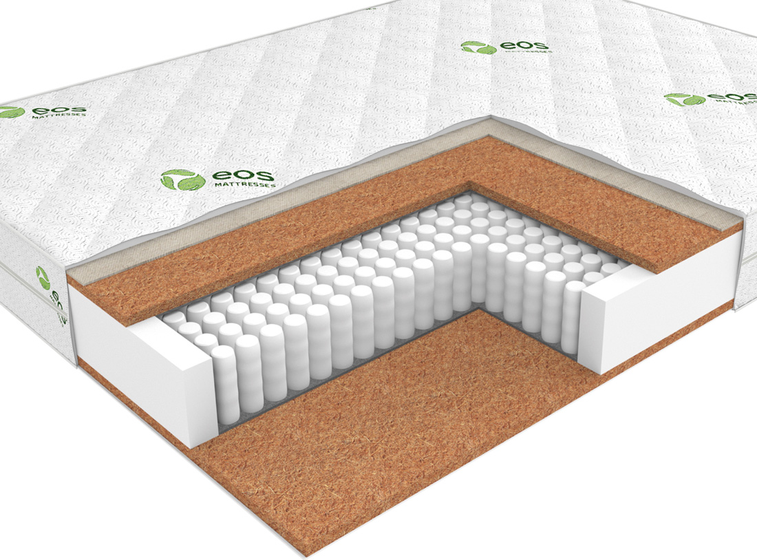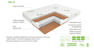| Материал | Блок независимых пружин, Хлопковое полотно, Чехол, FoamLux, Кокосовое волокно, Латексированная кокосовая плита, Усиление по периметру матраса |