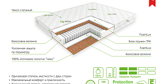 | Материал | Блок независимых пружин, Хлопковое полотно, Чехол, FoamLux, Кокосовое волокно, Усиление по периметру матраса |