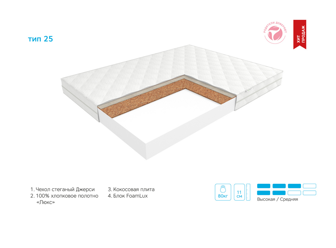 | Материал | Хлопковое полотно, Чехол, FoamLux, Кокосовое волокно |