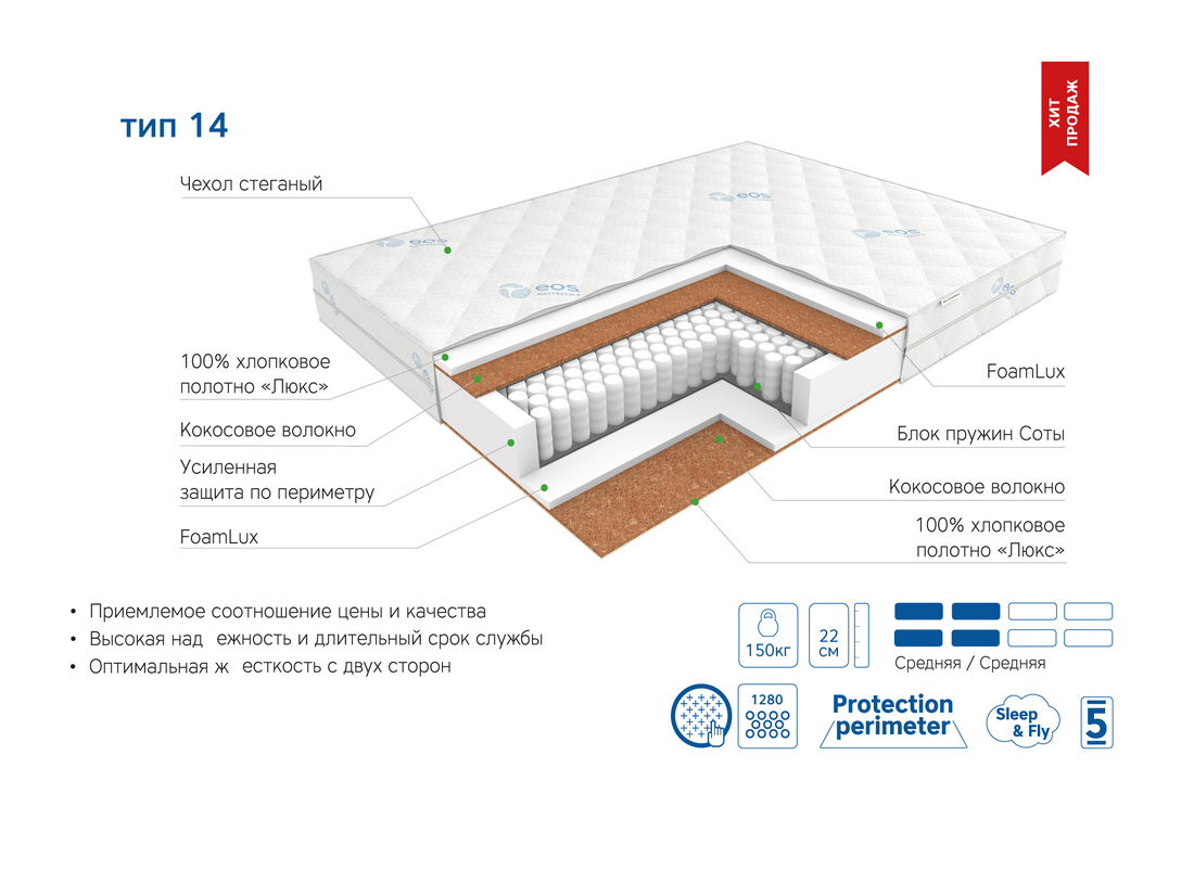 | Материал | Блок независимых пружин, Хлопковое полотно, Чехол, FoamLux, Кокосовое волокно, Усиление по периметру матраса |