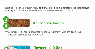 | Кокосовая койра | Натуральный материал, состоящий из спрессованных волокон кокосового ореха, полностью пропитанных латексом. Слои из прочной и долговечной кокосовой койры используются для придания матрасу дополнительной жесткости. |
