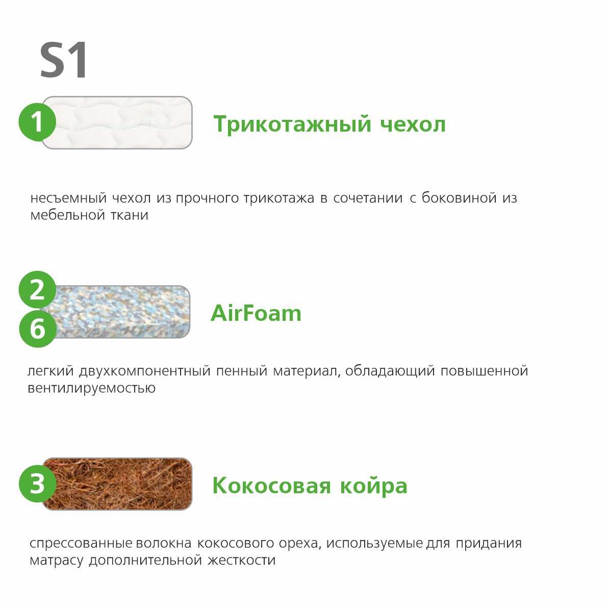 | Кокосовая койра | Натуральный и экологичный материал, природные качества которого усовершенствованы с помощью современных технологичных решений. Расположенные определенным образом волокна кокоса повышают упругость матраса, улучшают его ортопедические свойства и поднимают комфорт на абсолютно новый уровень. |