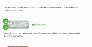 | AirFoam | Двухкомпонентный материал, состоящий из гранул пенополиуретана и связующего вещества полиэфира. Технология PressFree позволяет бережно и надежно соединить волокна различных цветов и фактур, обеспечивая материалу легкость и повышенную вентилируемость. |