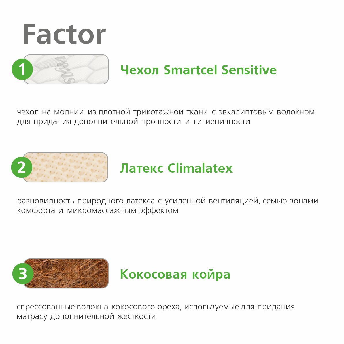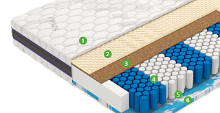 | Climalatex | Разновидность латекса с усиленной перфорацией и повышенной вентиляцией. Имеет рельефную форму с семью зонами комфорта и микромассажным воздействием. Надежно подстраивается под контуры тела, обеспечивая расслабление. |