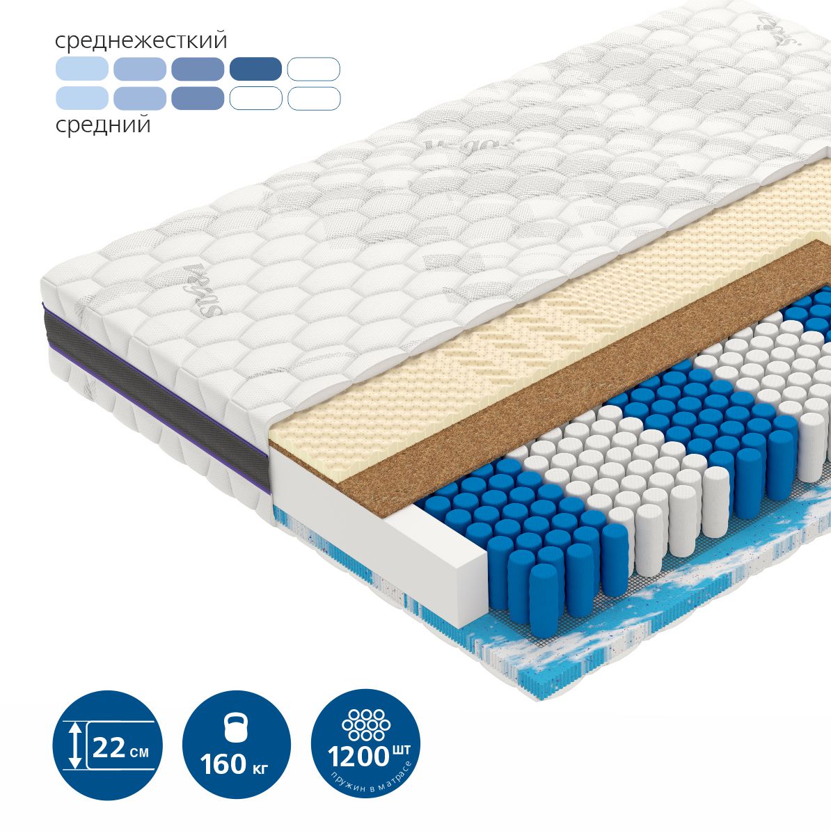 | Medizone R2200 | Блок независимых пружин из закаленной стали с выраженными зонами. Сбалансированное распределение зон по длине матраса наиболее эффективно учитывает анатомию тела человека. Уникальная центральная зона обеспечивает поддержку людей разного роста. Диаметр пружины 40 мм. Высота пружинного блока 140 мм. |