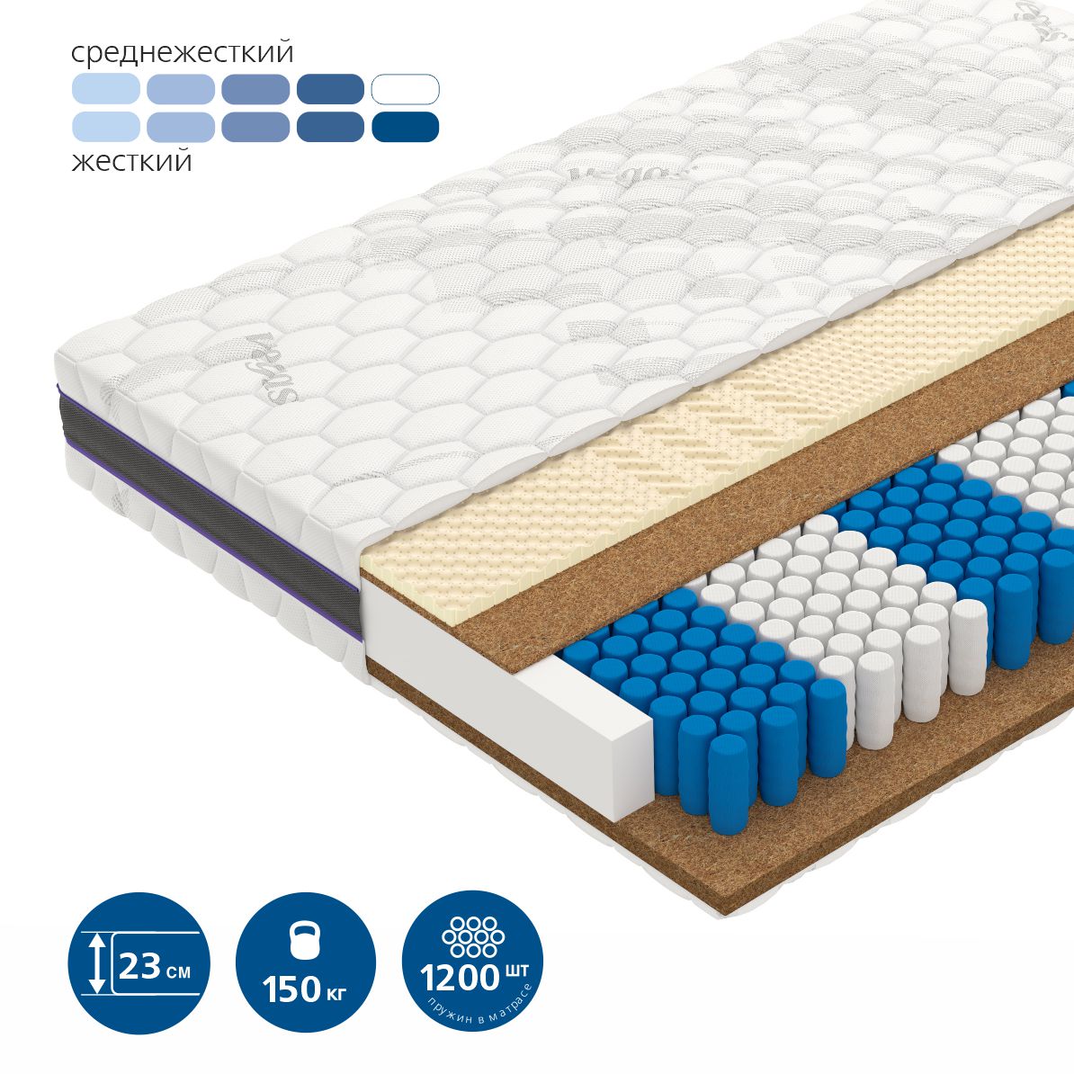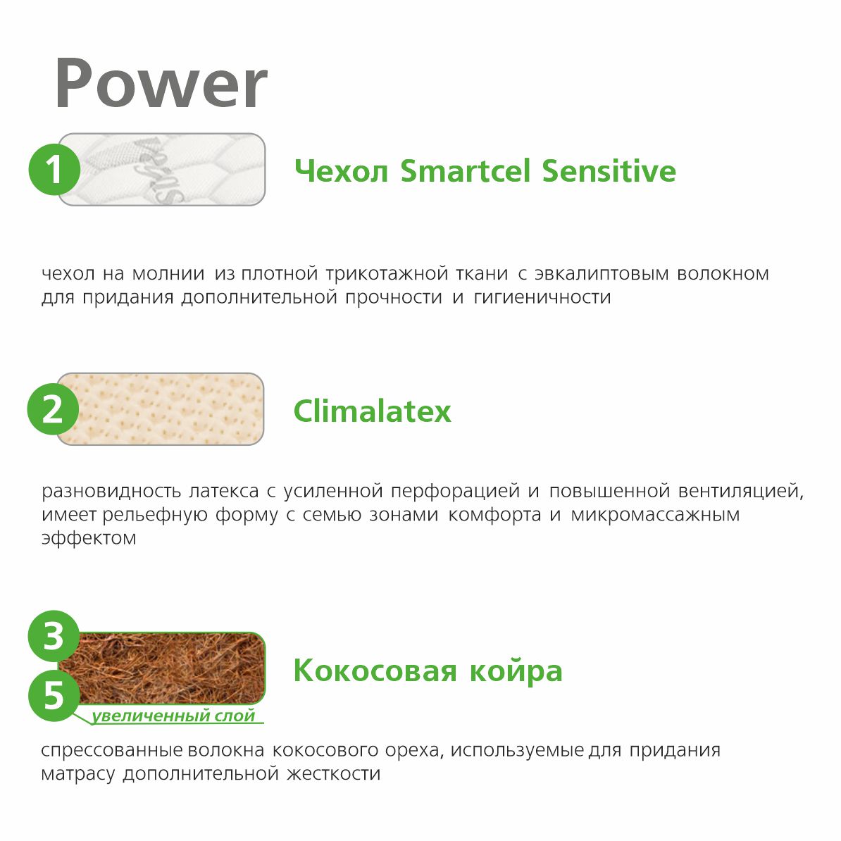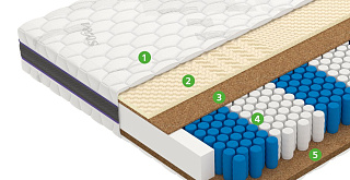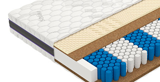 | Кокосовая койра | Натуральный материал, состоящий из спрессованных волокон кокосового ореха, полностью пропитанных латексом. Слои из прочной и долговечной кокосовой койры используются для придания матрасу дополнительной жесткости. |