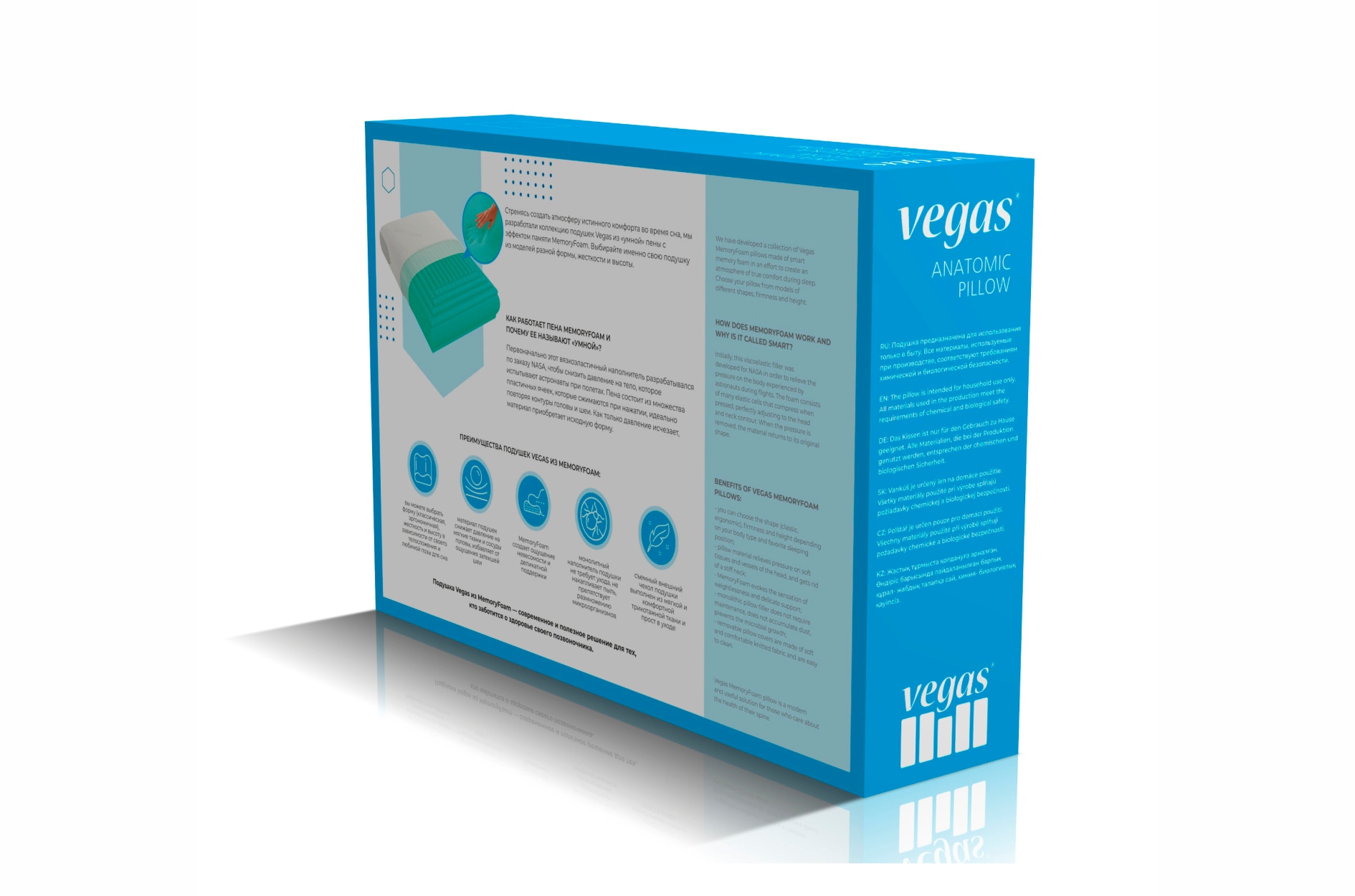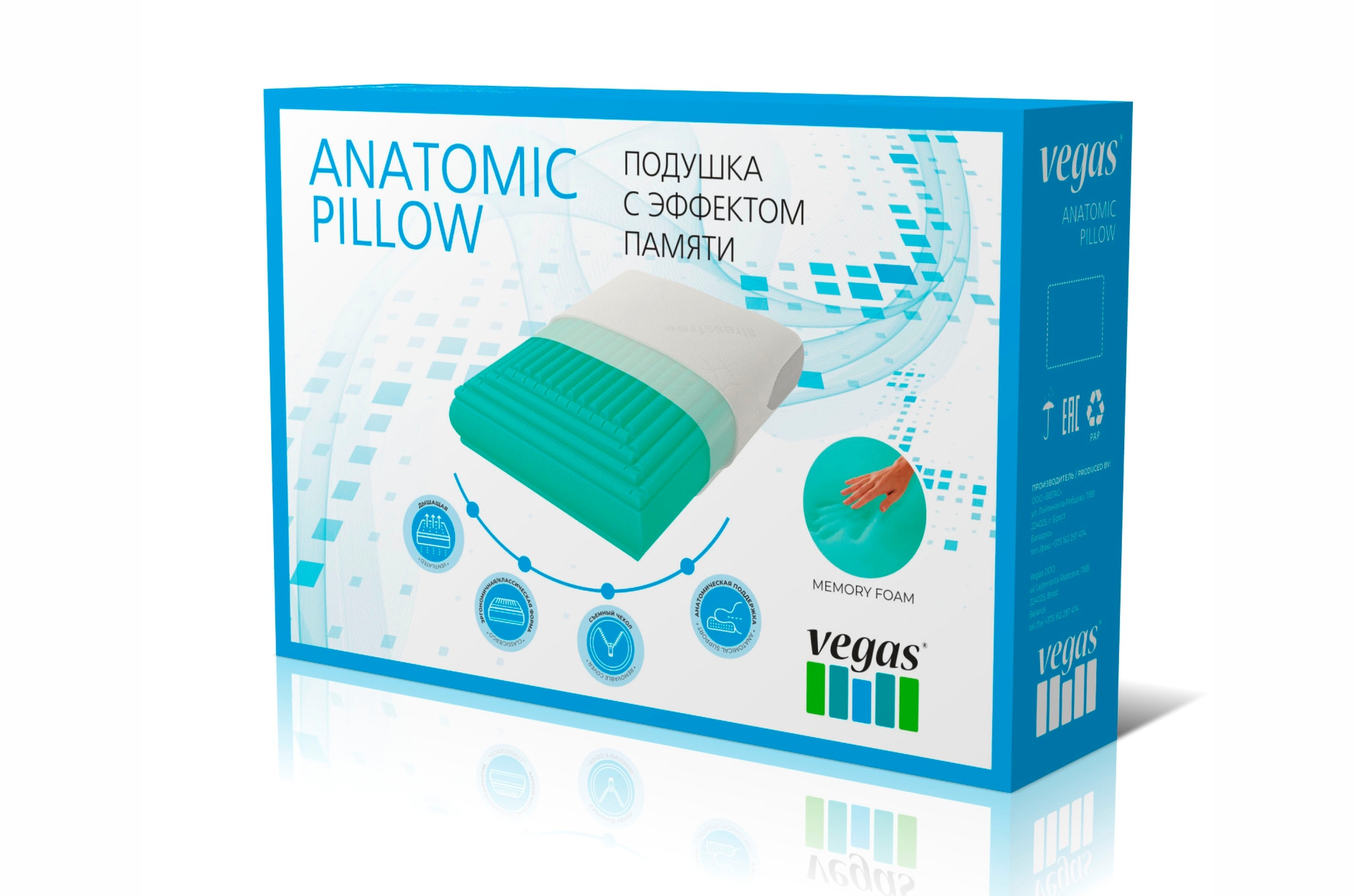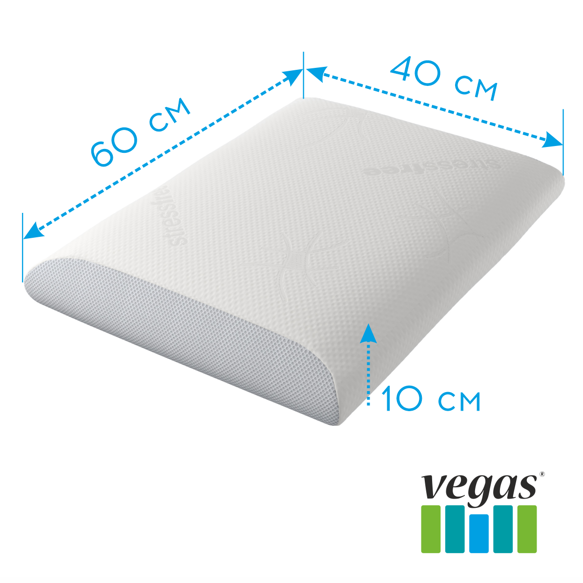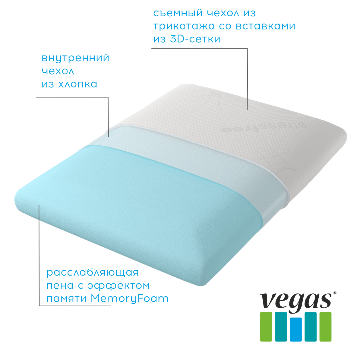 Модель подушки Vegas Champion классической формы из материала с памятью формы MemoryFoam подойдет детям старше 10 лет и подросткам, а также взрослым, предпочитающим низкие подушки.