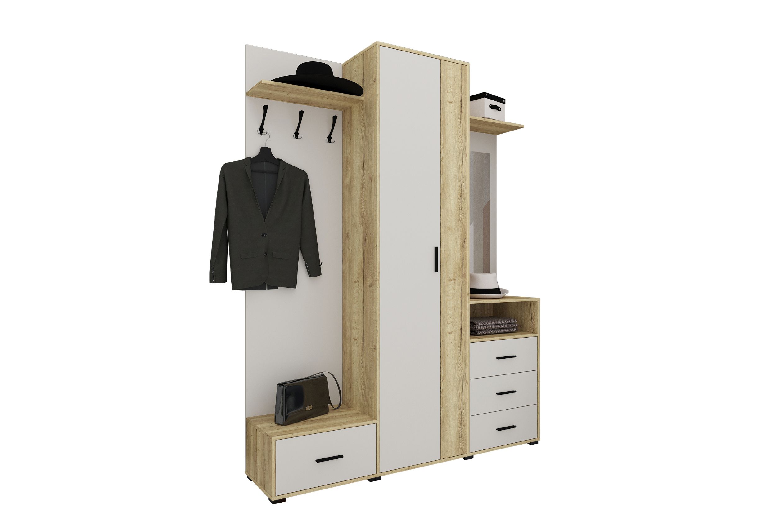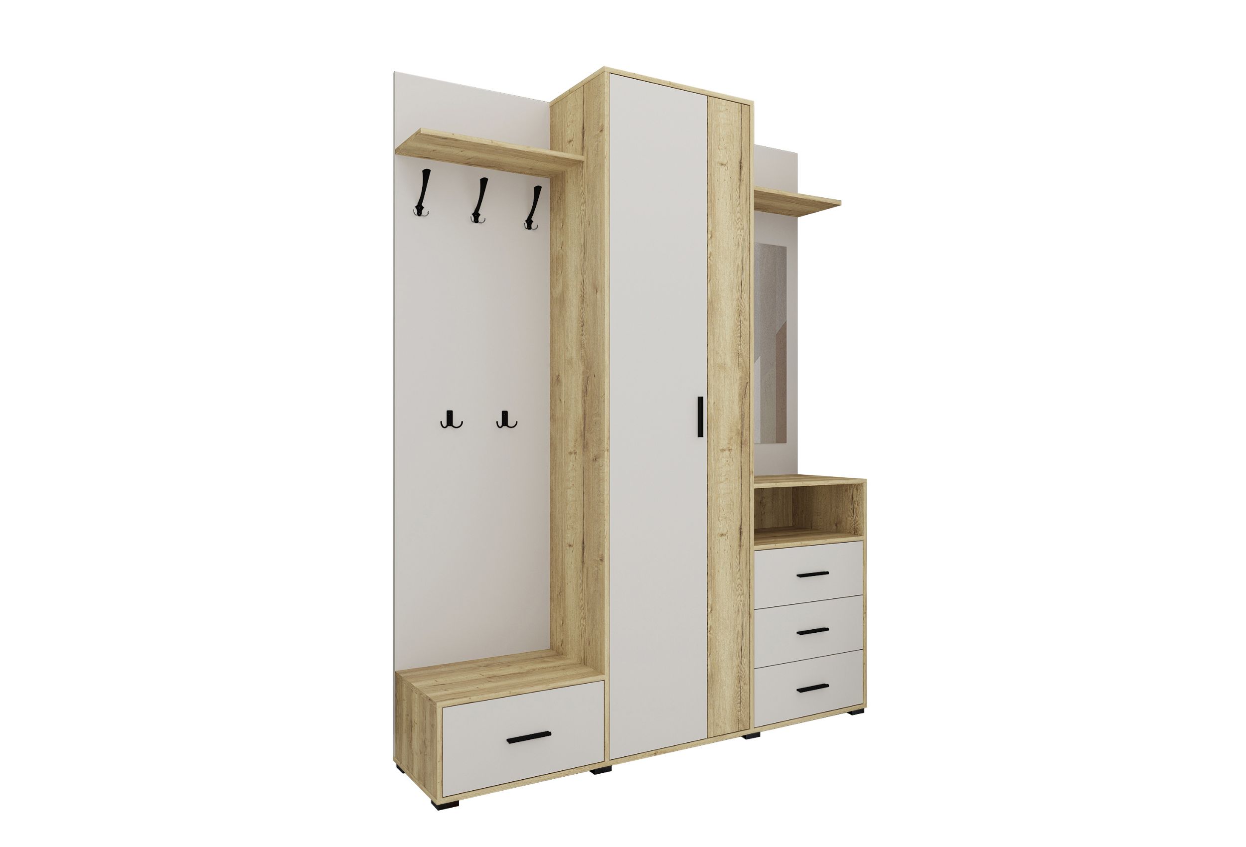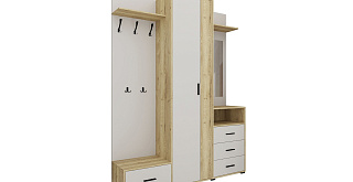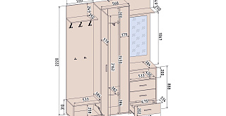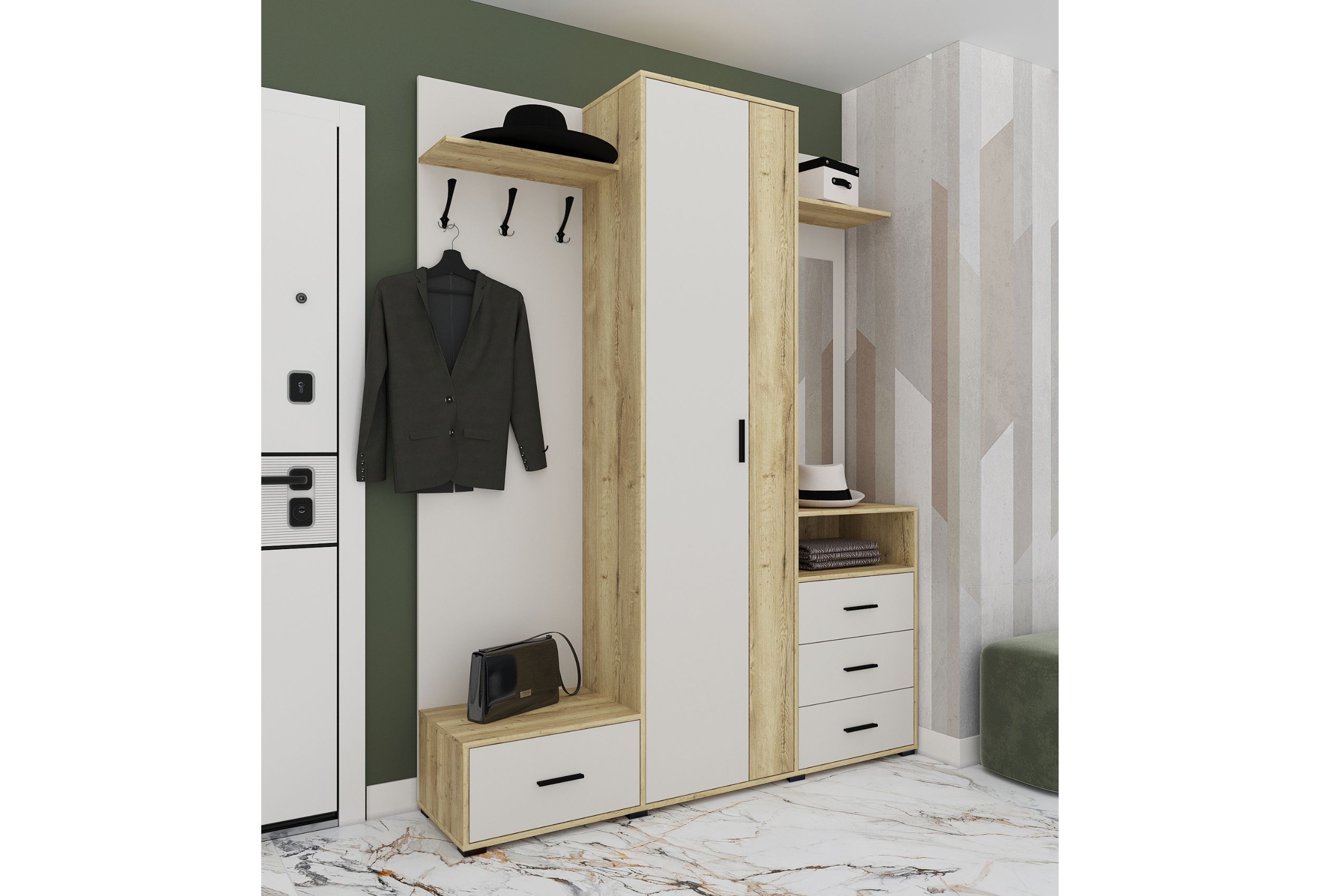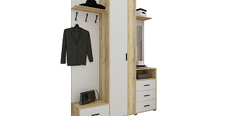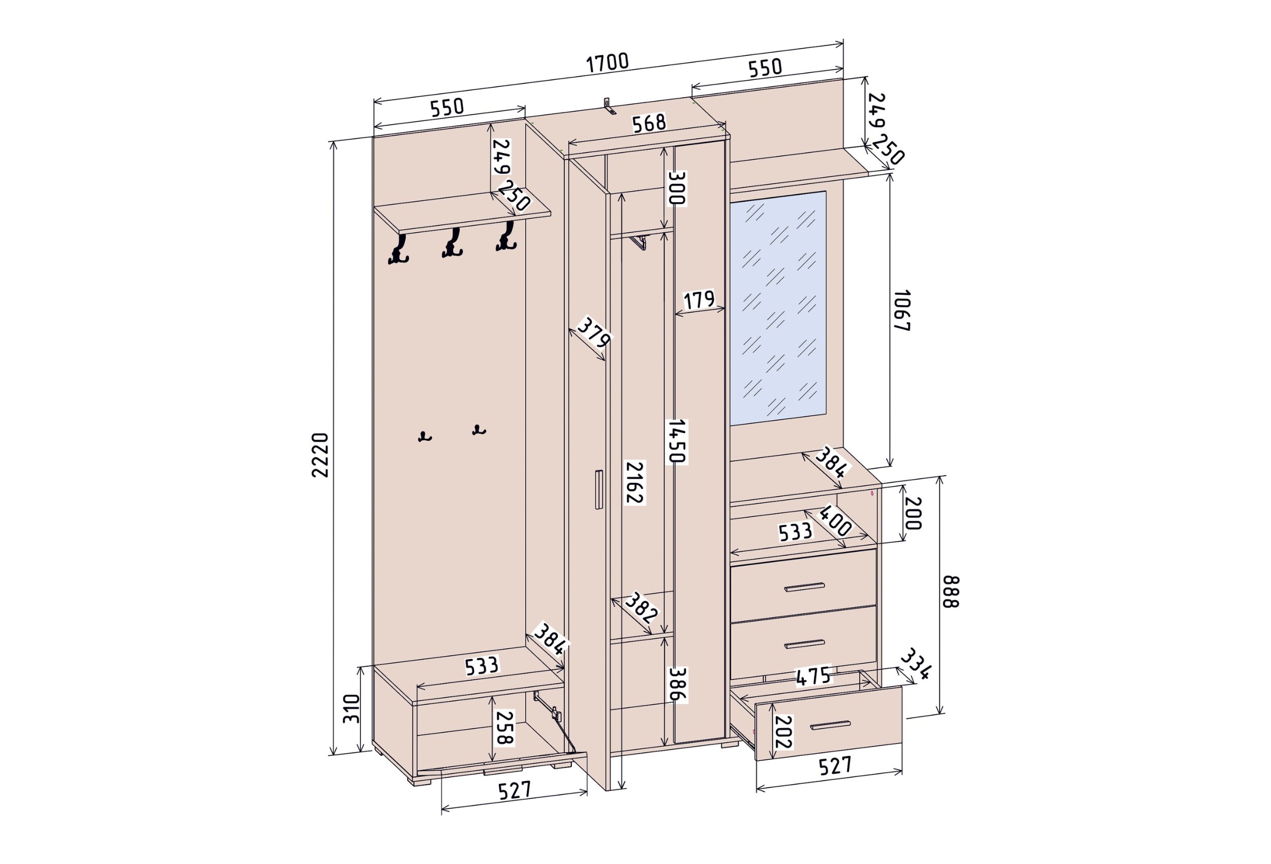 Полноценная прихожая, в которую входит шкаф с выдвижной вешалкой, 4 шуфляды полного выдвижения, зона с крючками для одежды, зеркало, открытые антресоли.