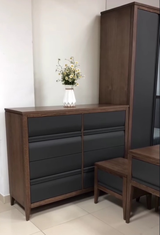 Чёрные ручки, тонкие опоры и лаконичные формы создают цельный образ, в котором сочетаются функциональность и эстетика. Мебель выглядит собранно и уверенно, идеально подходя для тех, кто ценит порядок и выразительность.
