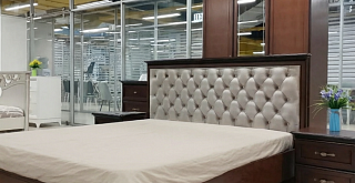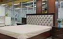 - кровать без ножной спинки. Высокое изголовье обшито бежевой тканью в квадратной стяжке с пуговицами-кнопками;