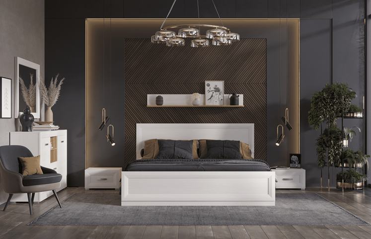 Великолепные фасады коллекции Malta удачно контрастируют со вставками из "ореха лион", продолговатые металлические ручки добавляют изящества, а подсветка стеклянных полок выгодно подчеркивает древесную структуру.