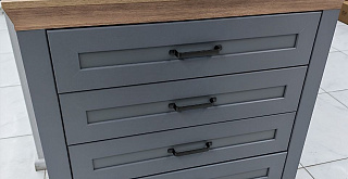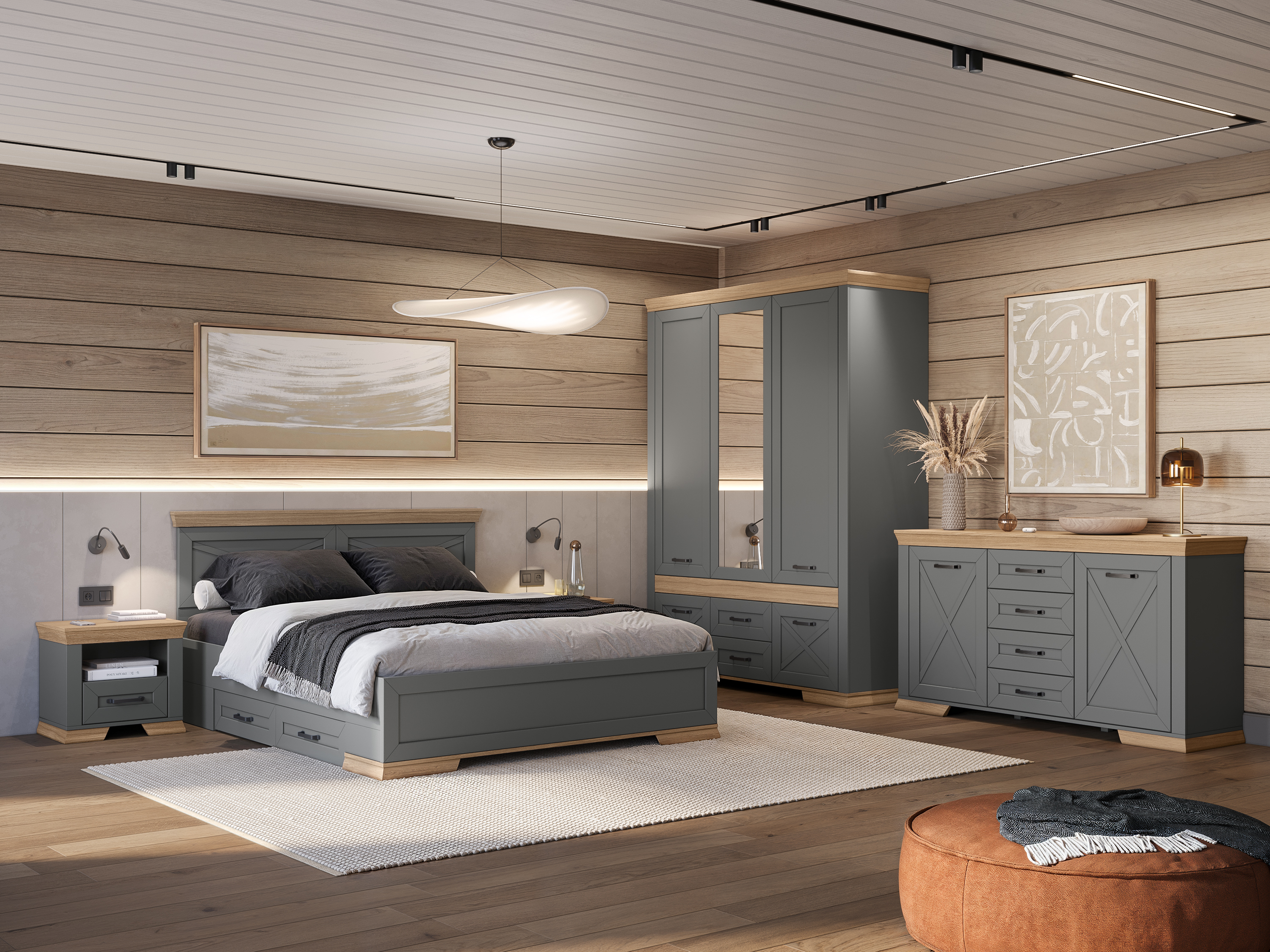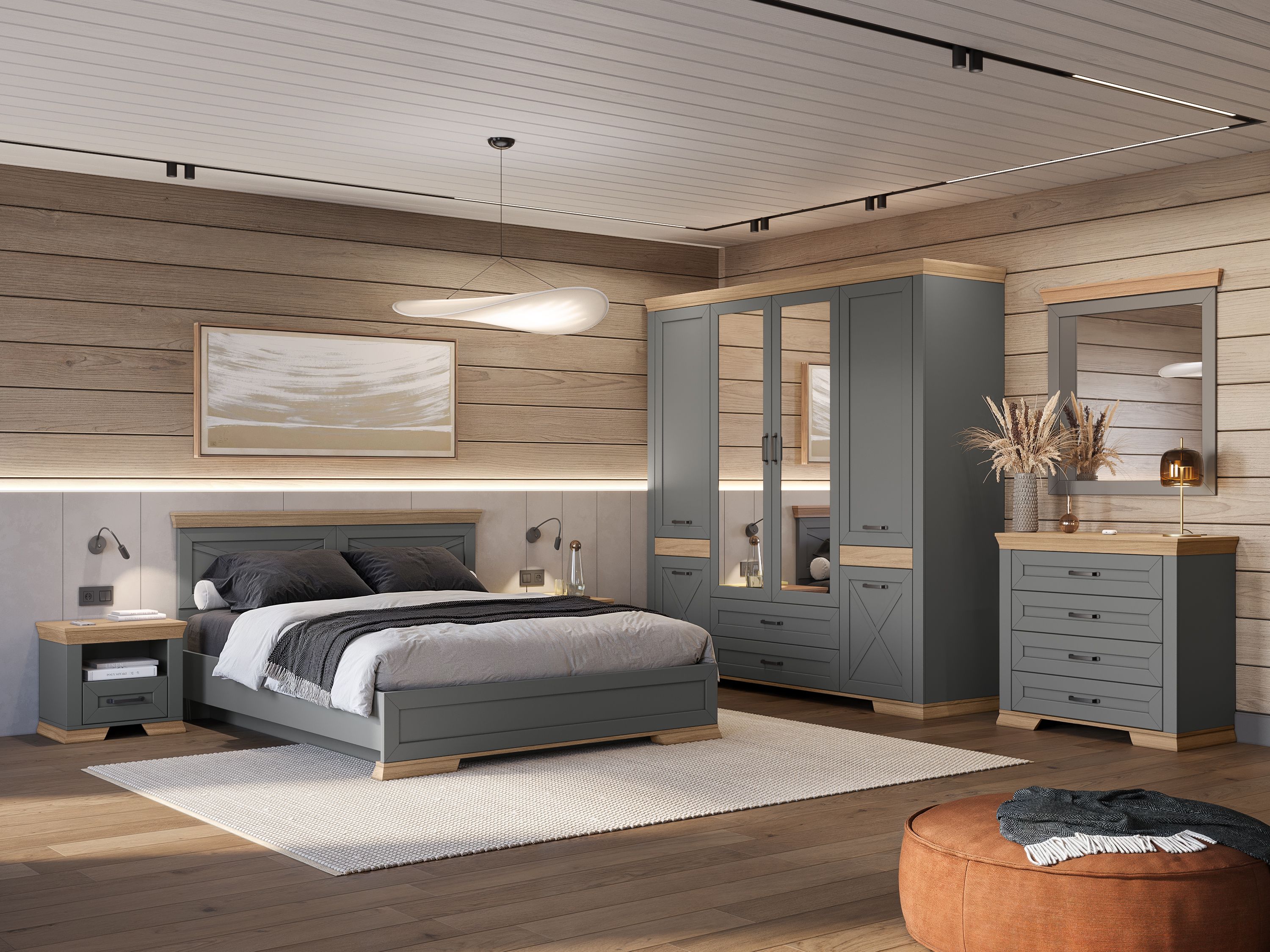 Нейтральные сдержанные оттенки серого в сочетании с тёплыми красками древесного, фасады со шпросами, кованные ручки, массивные карнизы, достаточно места для хранения вещей и мелочей – атмосфера располагающая к мечтам и релаксу.